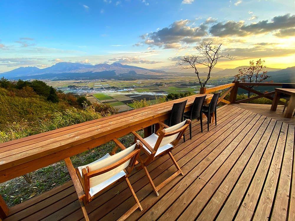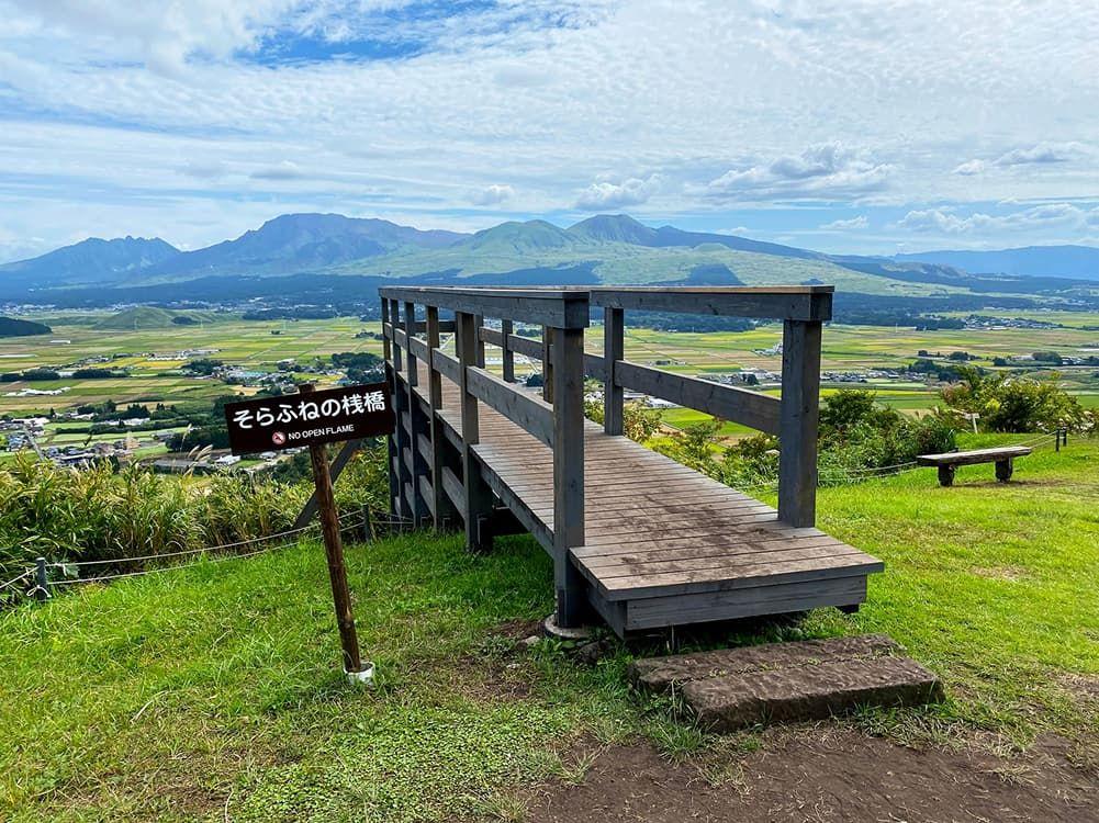 阿蘇市の田子山展望所にある標高653mの展望スポットです。木のデッキが阿蘇の空へ飛び出すように伸び、阿蘇五岳や内牧温泉街の絶景を一望できます。雲海のシーズンには幻想的な景色に出会えることも。