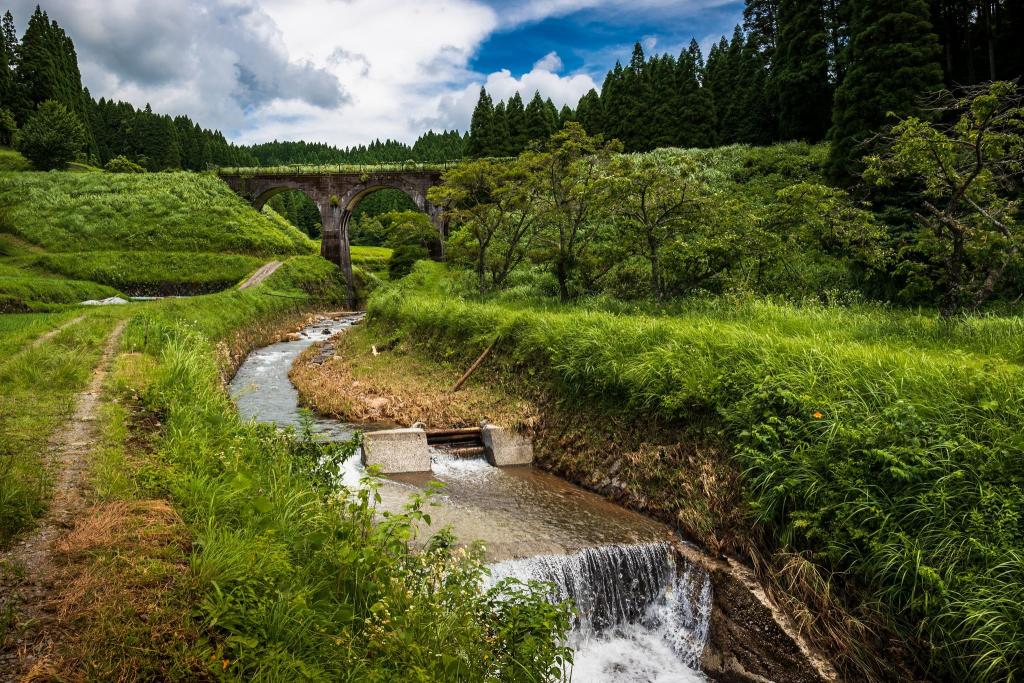かつて熊本県を走っていた国鉄宮原線の廃線跡に残る鉄道橋で、鉄道ファンや歴史好きに人気のスポットです。緑豊かな渓谷に架かる橋梁は、昭和初期に建設されたコンクリートアーチ構造で、当時の土木技術の高さを感じられます。現在は遊歩道として整備され、橋の上を歩きながら周囲の自然を楽しむことができます。