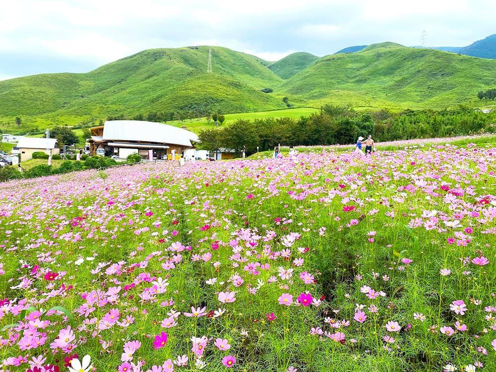 阿蘇の自然に囲まれた交流施設です。地元の新鮮野菜や特産品が並ぶ物産コーナー、田舎料理が楽しめるレストランがあり、秋には100万本のコスモスが咲き誇り、多くの観光客で賑わいます。