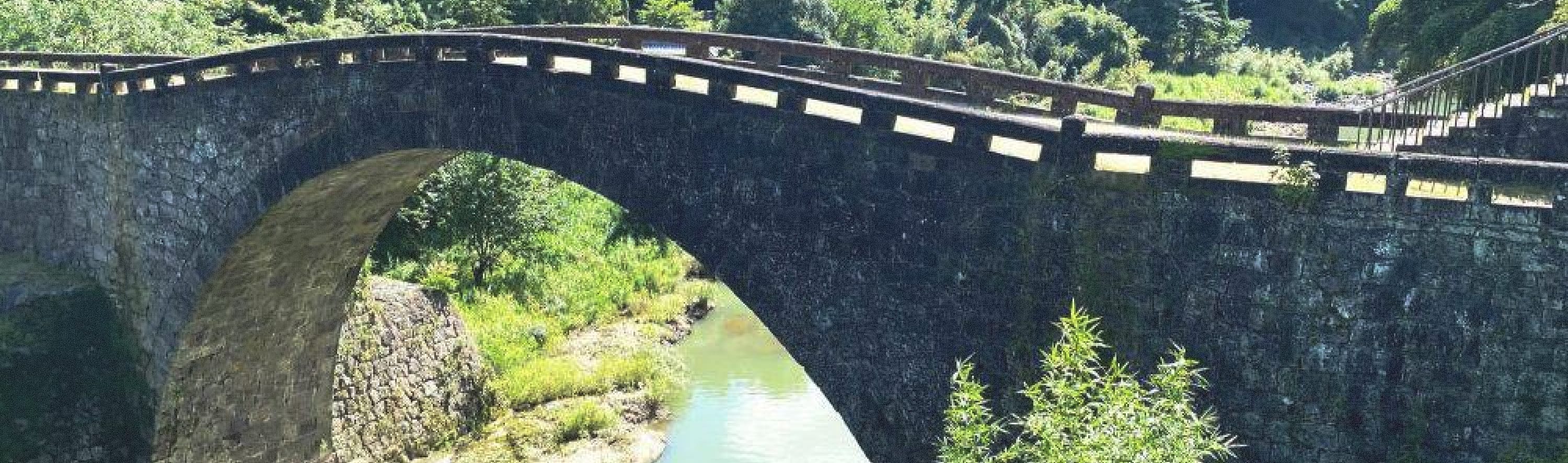 緑川に架かる日本最大級の江戸期の石造単アーチ橋です。船津峡で木橋が流失を繰り返したため、惣庄屋・篠原善兵衛が石橋建設を計画し、大工棟梁伴七らが協力。石工棟梁・宇助のもと全国から集まった72人の石工が1846年から翌年にかけて完成させ、1966年まで道路橋として利用されました。
