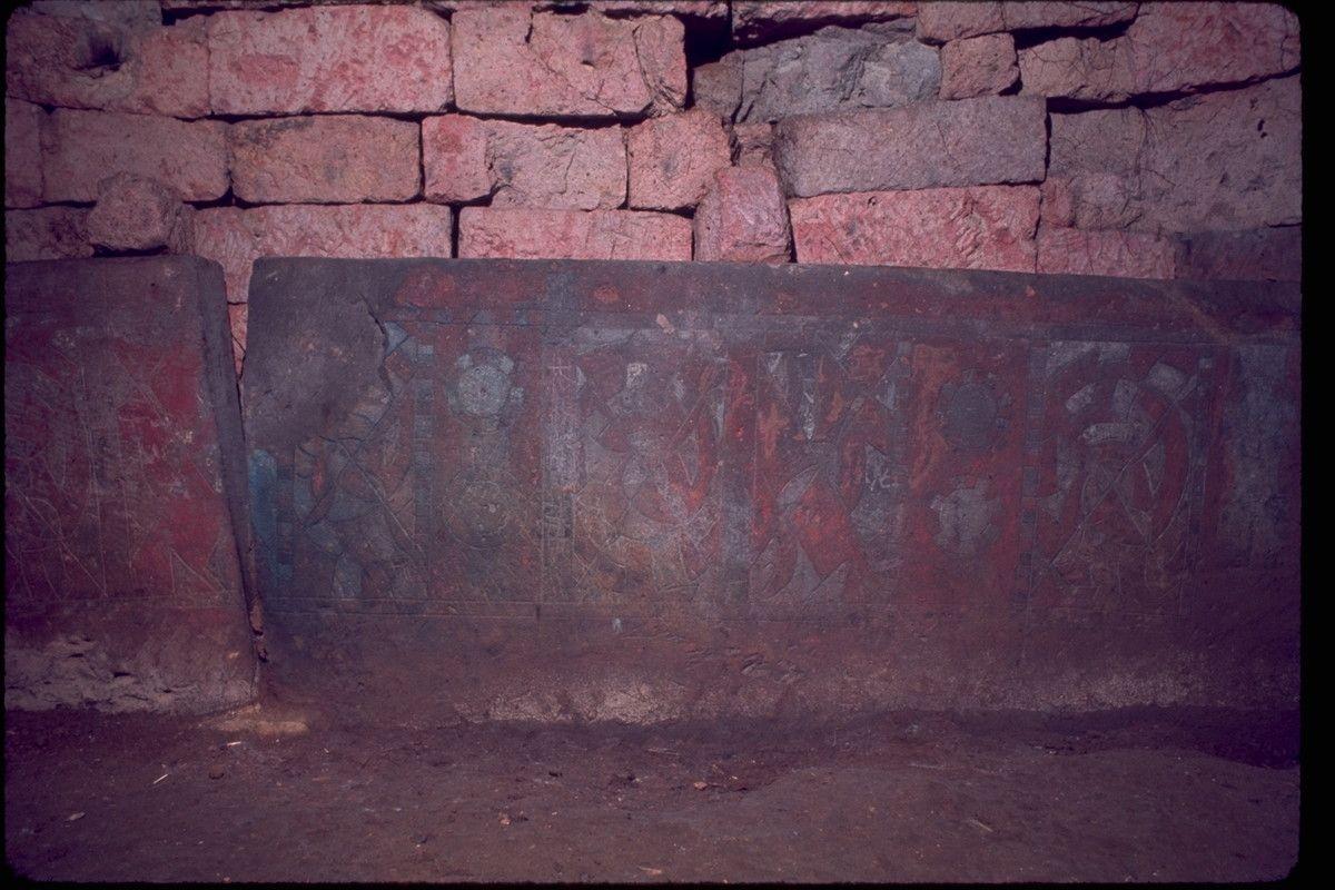埋葬施設は南西に入口をもつ横穴式石室で、凝灰岩の切石を使ったドーム状構造に石障が設けられています。内部は赤色顔料で全面が塗られ、直弧文・同心円文・梯子文などが赤・青・白・緑の彩色で描かれています。