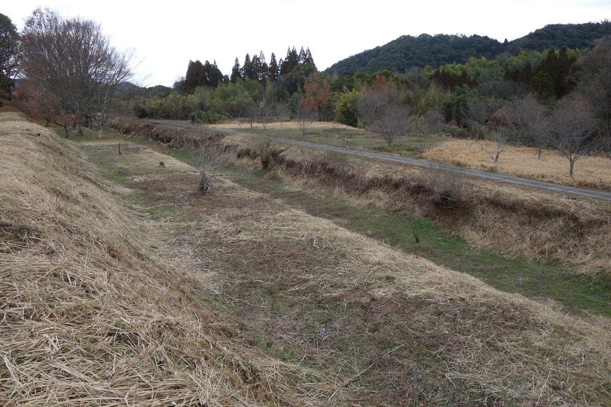 緑川右岸の標高100mの場所に位置します。大規模な空堀、その内側には土塁が残り、城の規模は東西210m、南北190m以上に及びます。