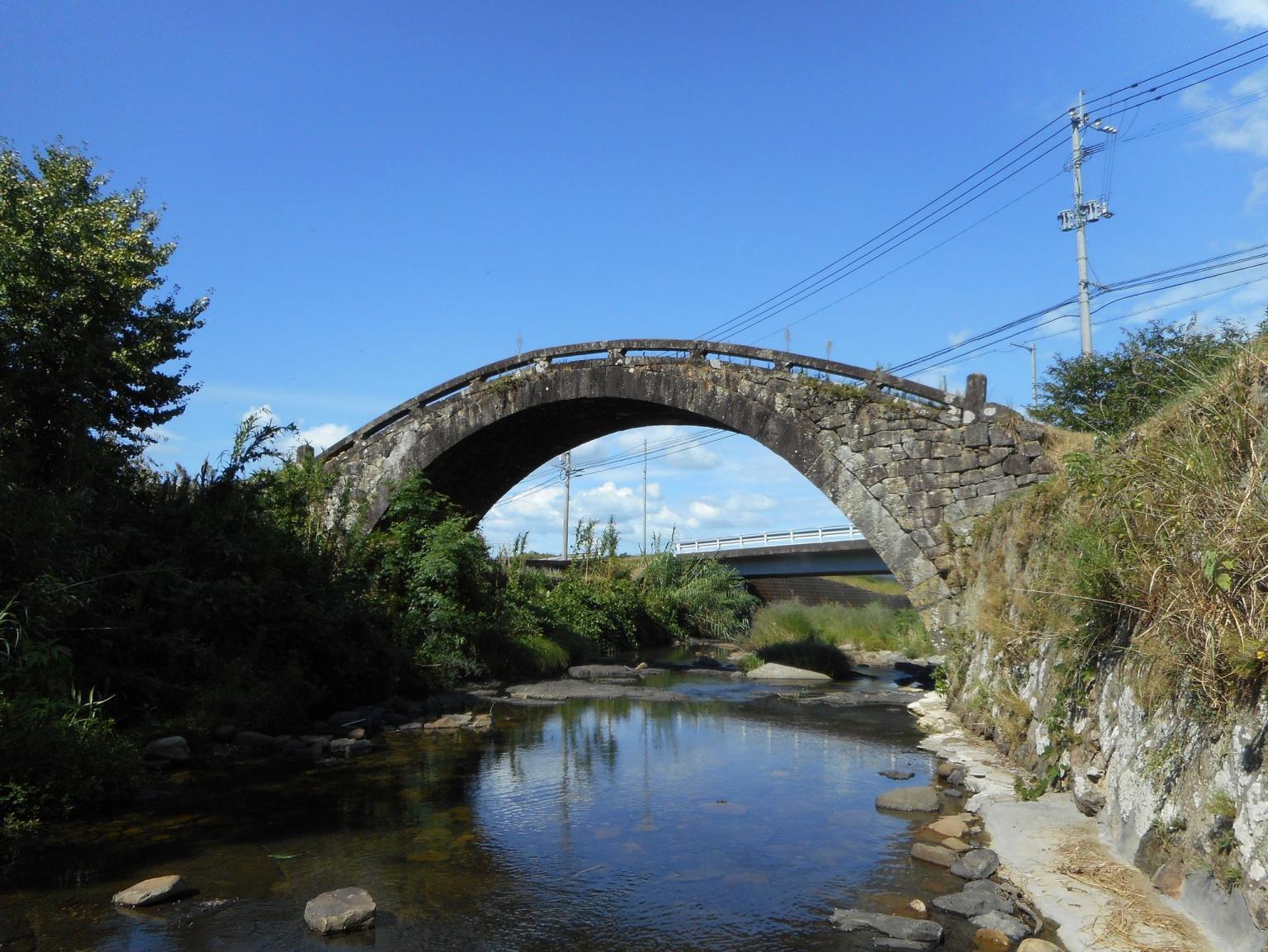 明治11年(1878年)に方原川に架けられた石造単アーチ橋です。優美かつ丈夫で、アーチの曲線に沿って、橋全体が大きく弧を描く形になっている点も特徴です。石材は天草産の下浦石(砂岩)で、足場枠組大工は楠浦村の和田茂七、石工は下浦の松次、打田の紋次など、建設には地元の石工たちが活躍しています。