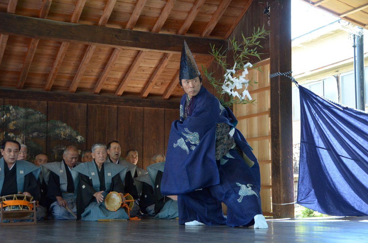中世に安定した統治を行い米作りの発展に寄与した菊池氏が、懐良親王(かねながしんのう)を迎え年頭の祝儀として行ったことを起源とする芸能です。中世の松囃子(まつばやし)の一形態を伝えるものとして重要であり、能の変遷過程を知る上でも全国的に貴重です。