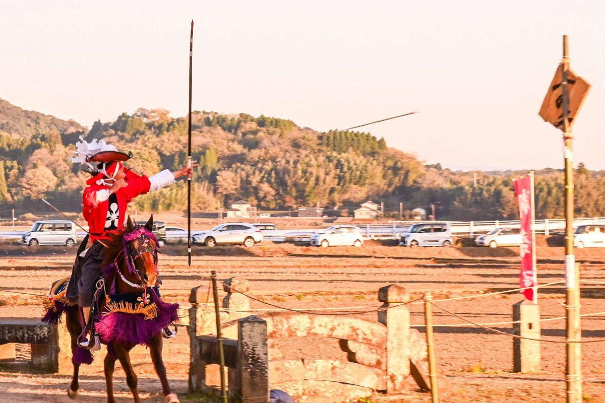 秋の大祭に神社で五穀豊穣に感謝して奉納される農村に伝わる流鏑馬(やぶさめ)です。