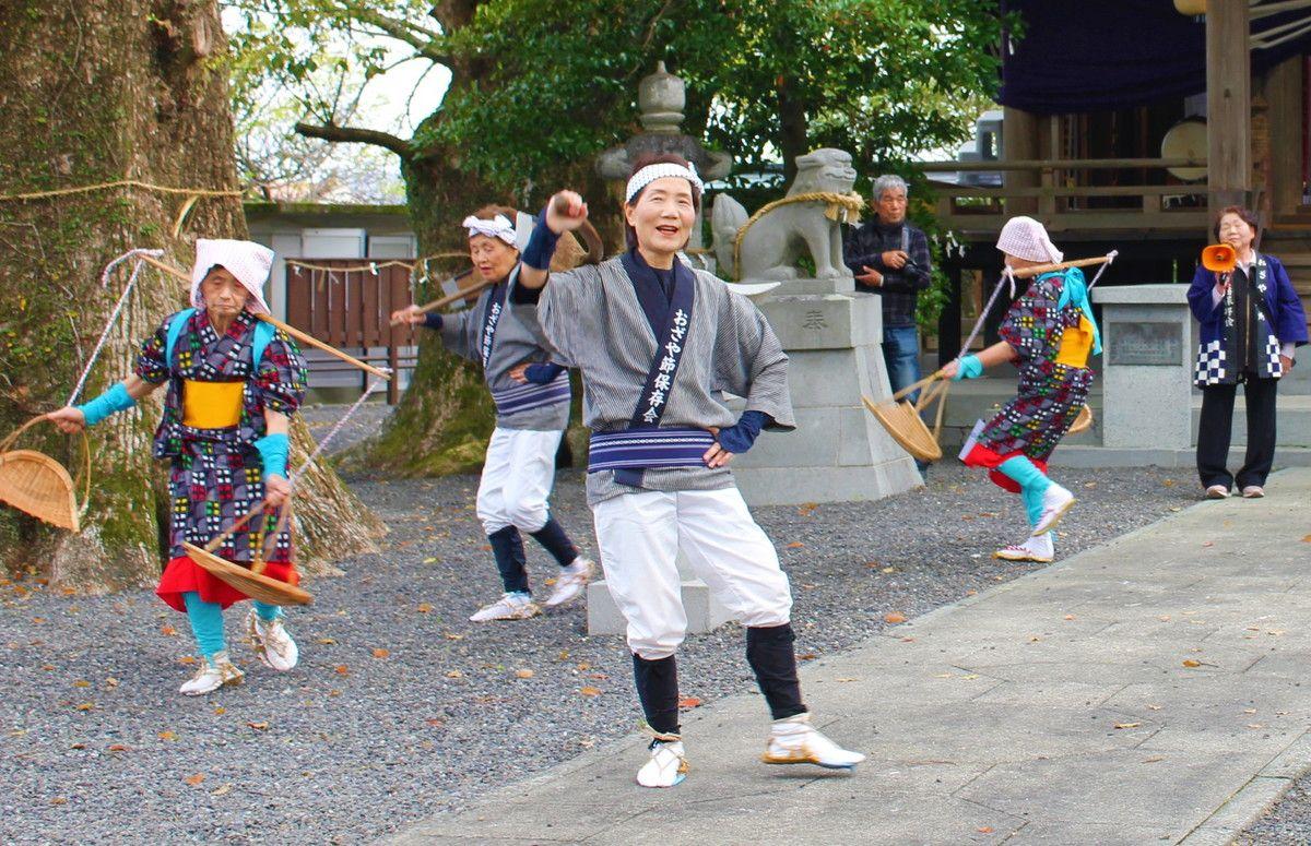 文政4年(1821年)の干拓事業の際発祥したといわれる「大鞘名所(おざやめいしょ)」を鏡町の芝口地区では「大鞘節(おざやぶし)」と呼んでいます。おざや節とは大鞘樋門に由来する労働歌に振りを付けた踊りです。芝口地区では、男役が鍬を持ち、女役が籠を担ぎ、唄に合わせて干拓工事の様子を再現して踊ります。地区の文化祭や印鑰(いんにゃく)神社大祭の際など、地域のイベントで踊られています。