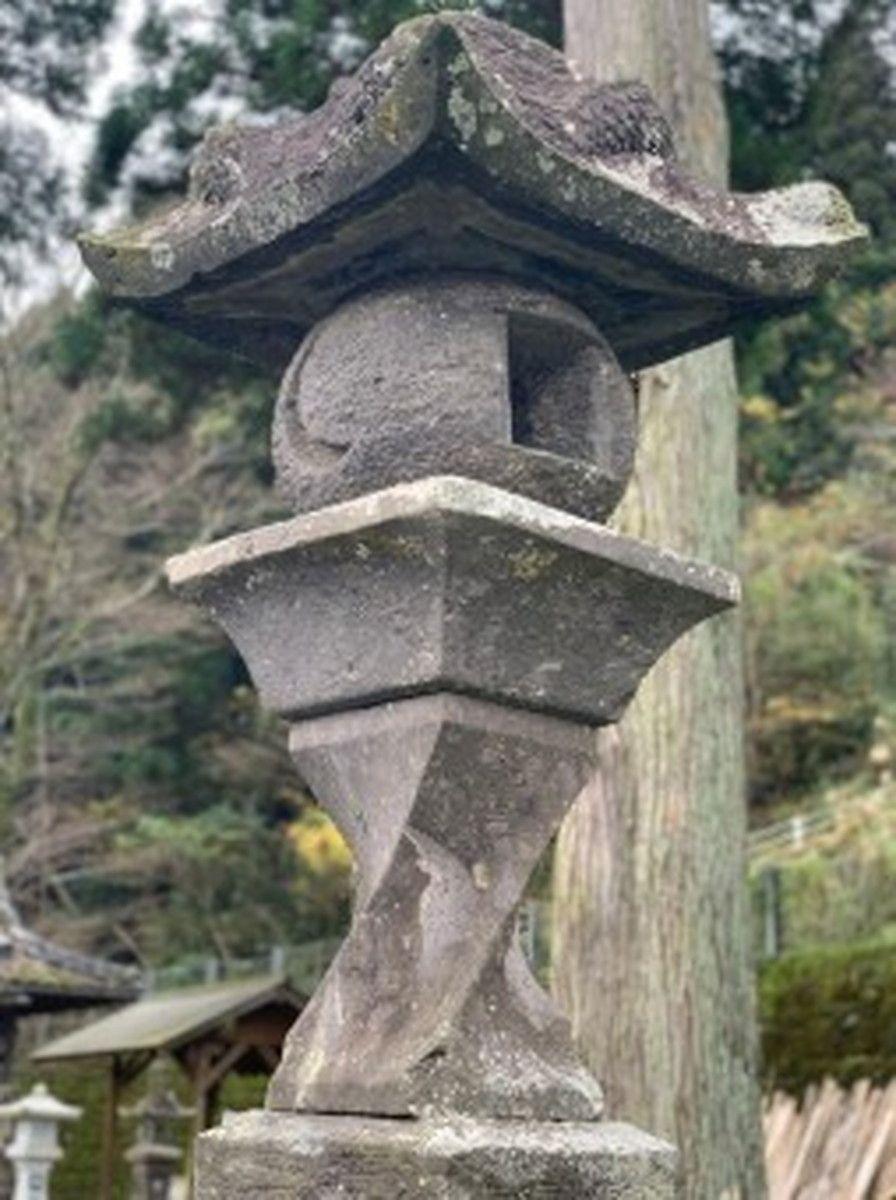 90度ねじれたように彫刻された石灯籠です。若宮神社の灯籠は嘉永4年(1851年)に橋本勘五郎が作ったと伝えられています。見た人に驚きを与え、石工の遊び心、技術の高さを今に伝えており、石工たちが暮らしていた「石工の郷」の雰囲気を醸し出しています。