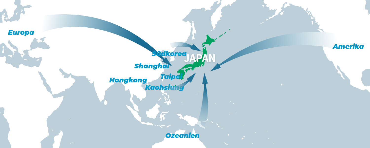 * Die obigen Angaben geben grob wieder, wie Sie von bedeutenden Städten des Landes mit den wichtigsten Verbindungen die Präfektur Kumamoto erreichen können. Die angegebenen benötigten Fahrzeiten sind Richtwerte für die jeweils schnellste Verbindung zwischen den einzelnen Abschnitten. Je nach Abfahrtszeit etc. können sich diese Zeiten ändern. Bitte prüfen Sie vor Ihrer Reise auf den Webseiten der jeweiligen Verkehrsanbieter nochmals die aktuelle Lage.
