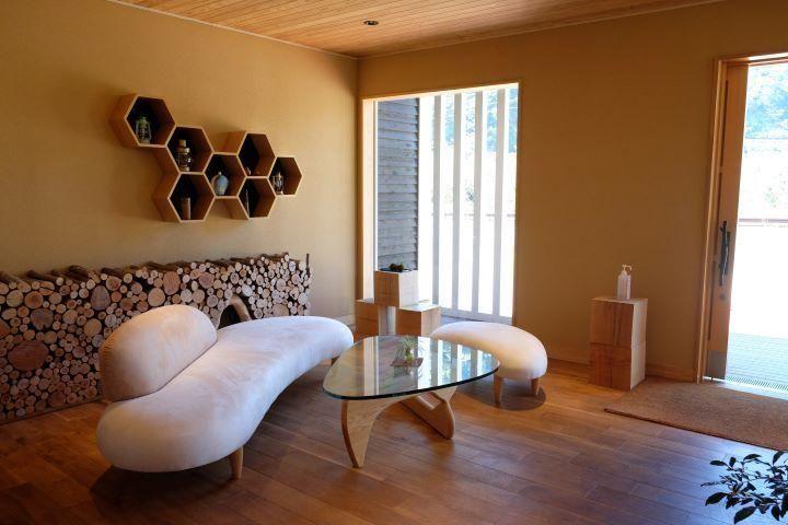 The inside of the rooms is a relaxing space made of local wood. A pellet stove is also available for use in the winter, with the flickering flames there to soothe you as you chat.