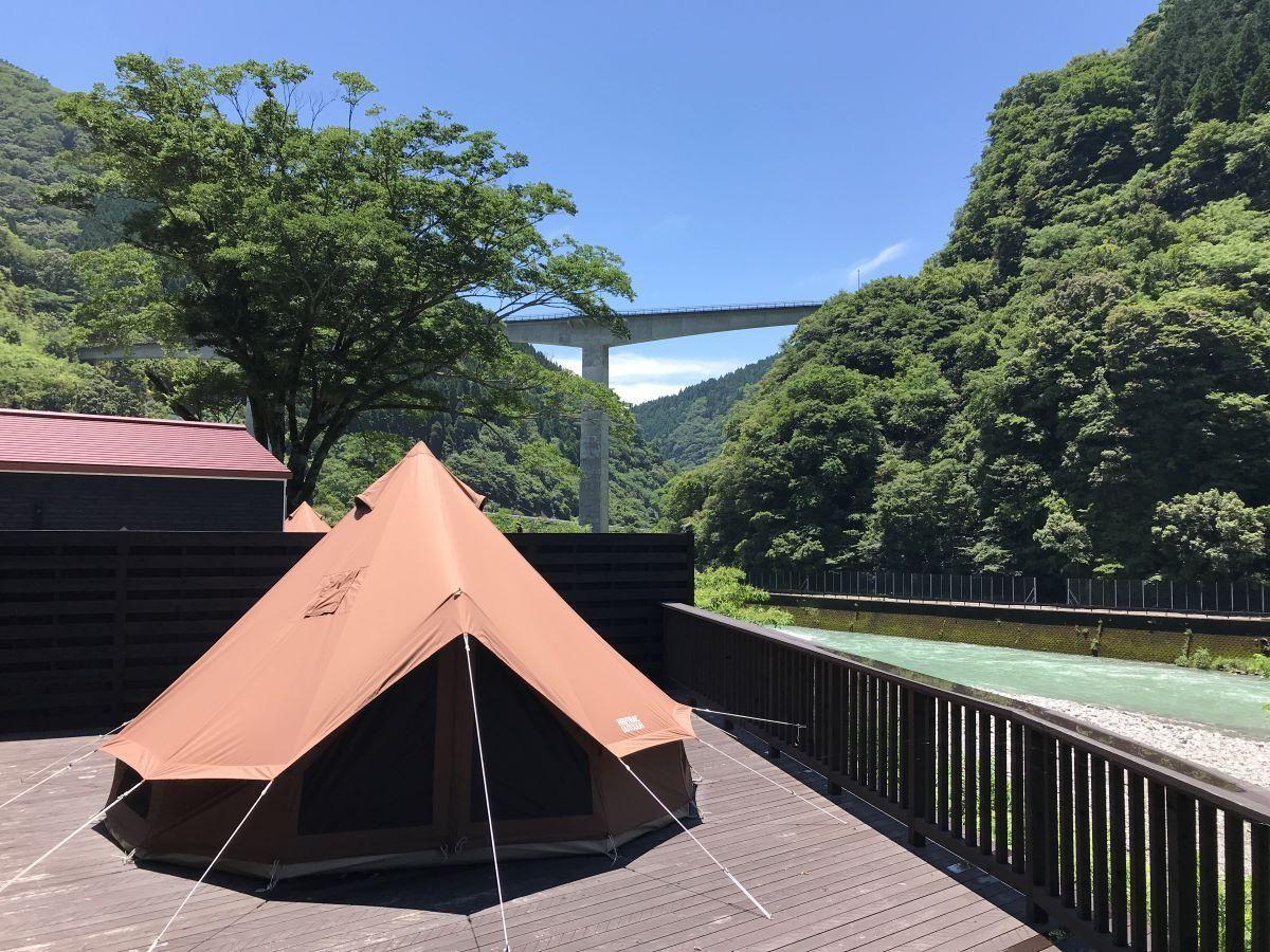 The wood deck is equipped with a tent for glamping (with a kotatsu also available in the tent during the winter). Enjoy an elegant outdoor atmosphere with the murmuring of the river and the stars in the night sky