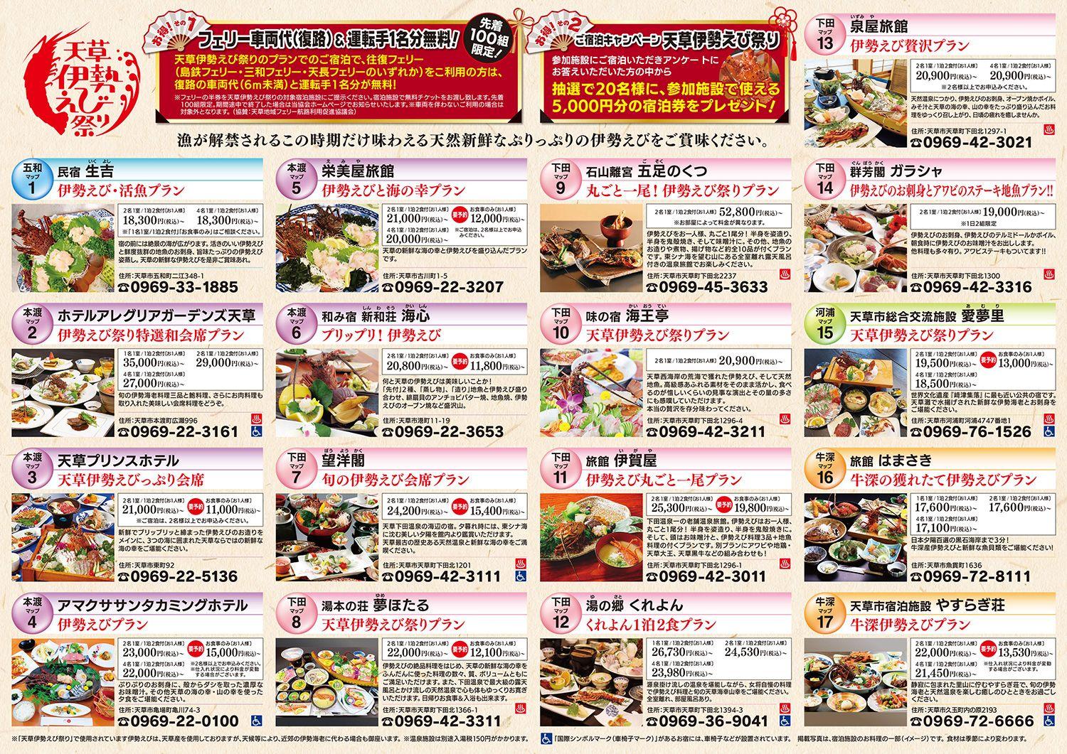 今年もこの季節! 天草市の17の宿泊施設で、宿自慢の伊勢えび料理が味わえる「天草伊勢えび祭り」が開催中です。各お宿ごとに、新鮮な天然伊勢えび料理(3品以上)と海鮮料理が食べられる宿泊プランをご用意。漁が解禁されるこの時期だけ味わえる、ぷりっぷりの伊勢えびを堪能できるチャンスです。宿泊プラン、食事のみプラン共に要予約。