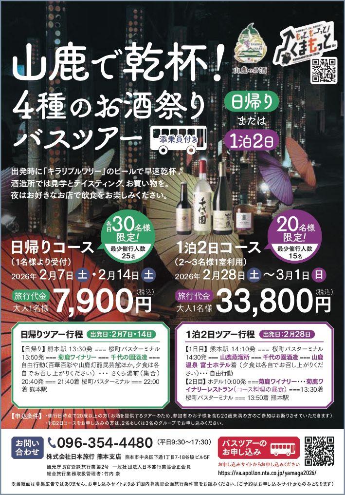 1月31日から始まる「山鹿4種のお酒祭り」にあわせて、バスツアーの開催が決定しました。(申込期限は1月30日15:00まで)日帰り・宿泊の2タイプから選ぶことができ、出発時に「キラリブルワリー」のクラフトビールで乾杯してスタート。各酒造所では、見学をはじめ、試飲やお買い物を楽しむことができます。夕食は、各自で手配するスタイルなので好きな山鹿グルメがじっくり味わえるのも魅力。この機会にお気に入りの一杯と出会いに出かけてみてください。