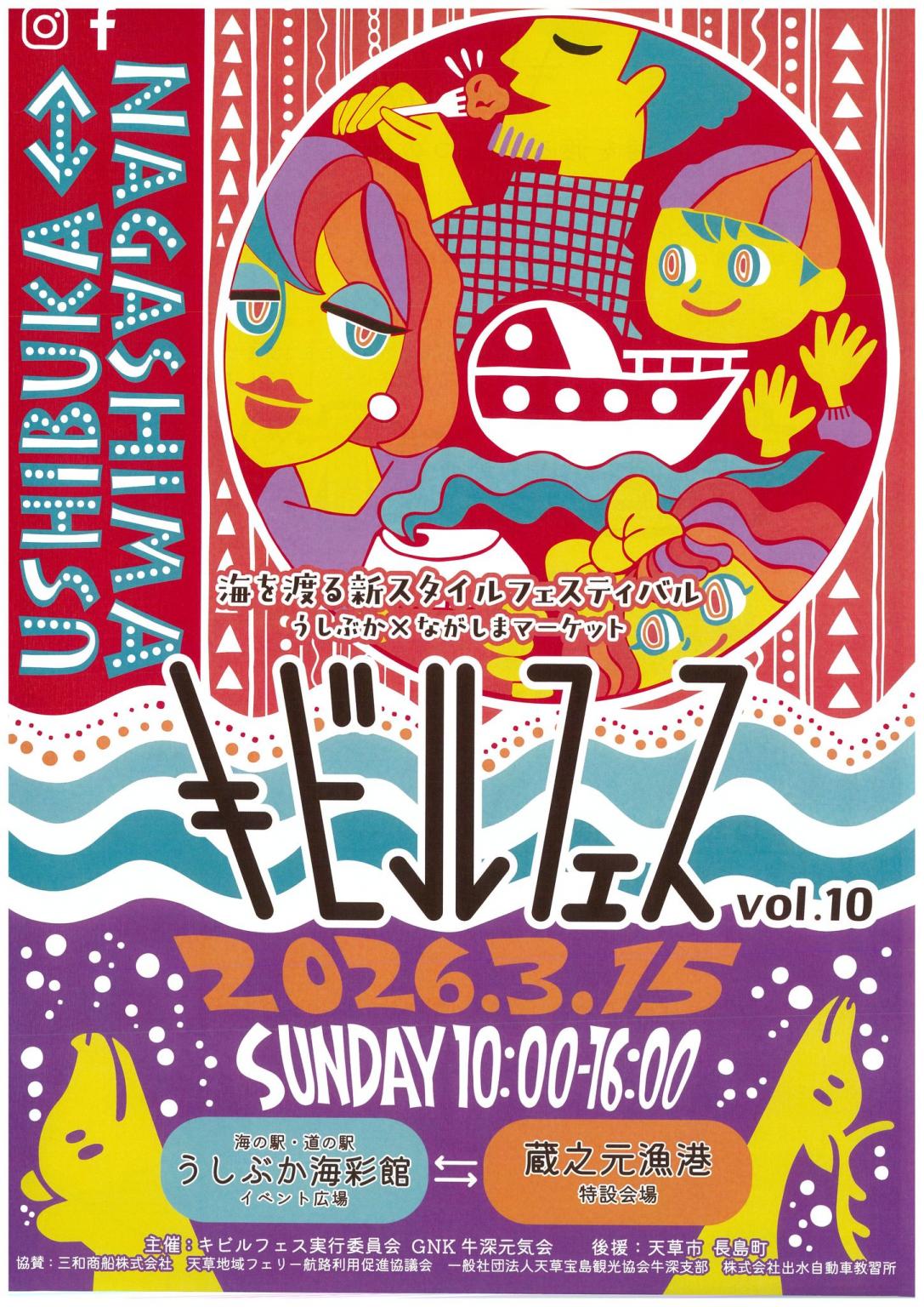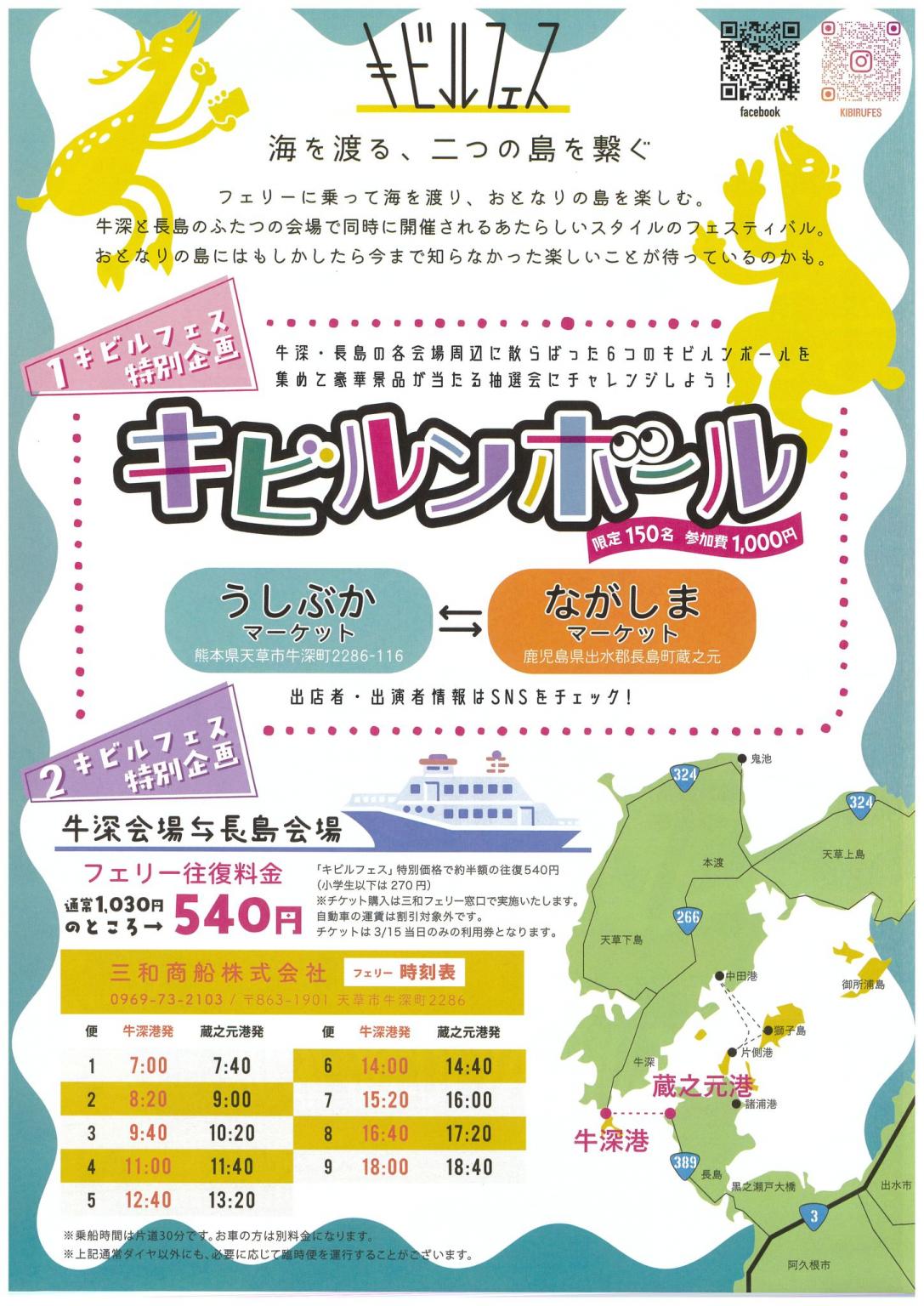 フェリーで海を渡り、二つの島を楽しむ新感覚のイベントが牛深と鹿児島県の長島町にて開催。海を越えて、それぞれの島のグルメやマーケット、ステージイベント等を満喫できます。両会場はフェリーで約30分で当日は特別運賃で往復可能です。さらに、150名限定で各会場周辺に散らばった6つのキビルンホールを集めると抽選会に参加できる特別企画も。豪華景品が当たります。ぜひ、波音とともに始まる特別な1日を楽しみませんか。