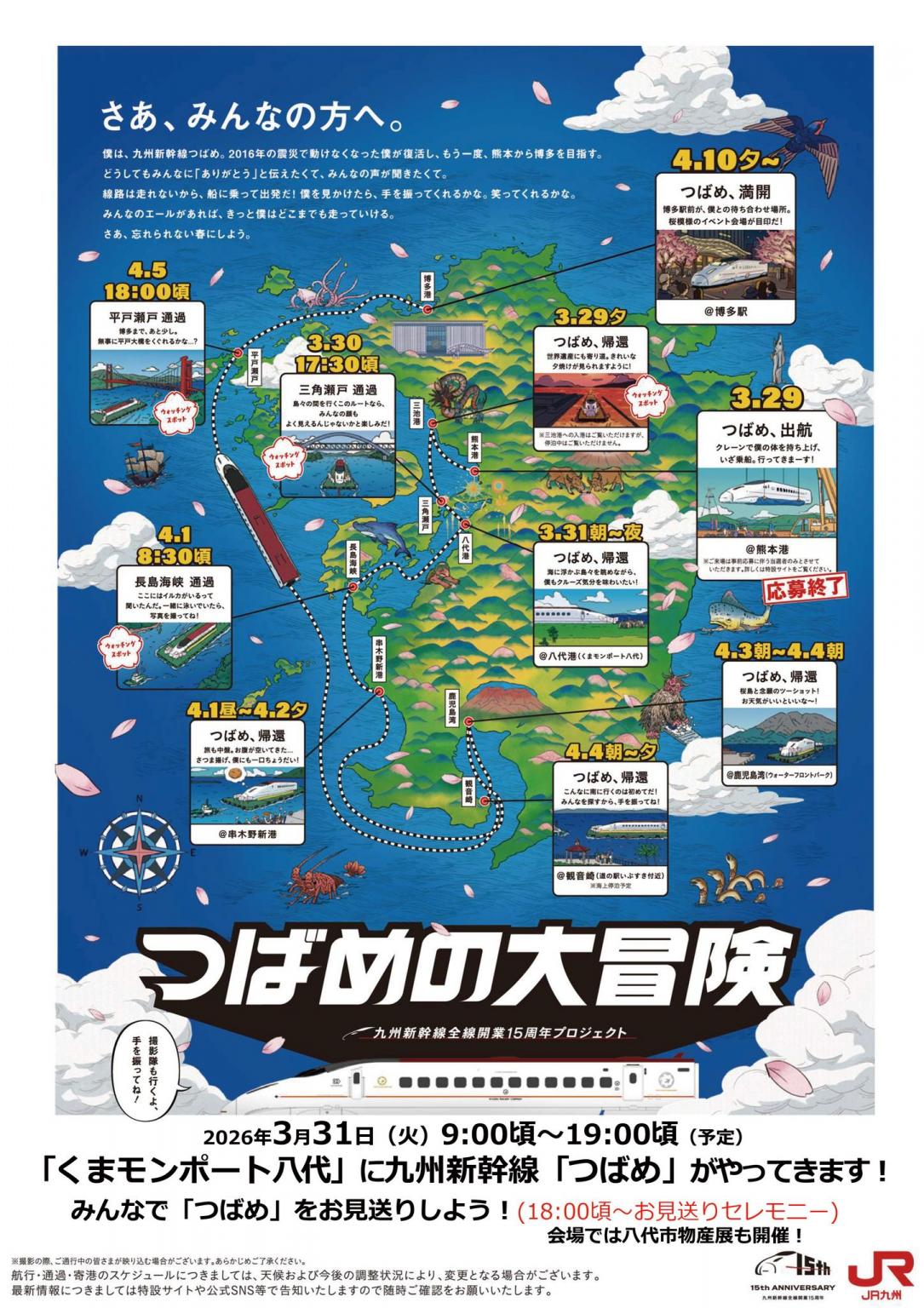 3月29日に熊本港を出発して、3月31日の朝~夕方にかけて八代港(くまモンポート八代)に帰還。八代港では物産展やお見送りセレモニーも予定されています。10年ぶりに動き出す「つばめ」に会いに行きませんか!