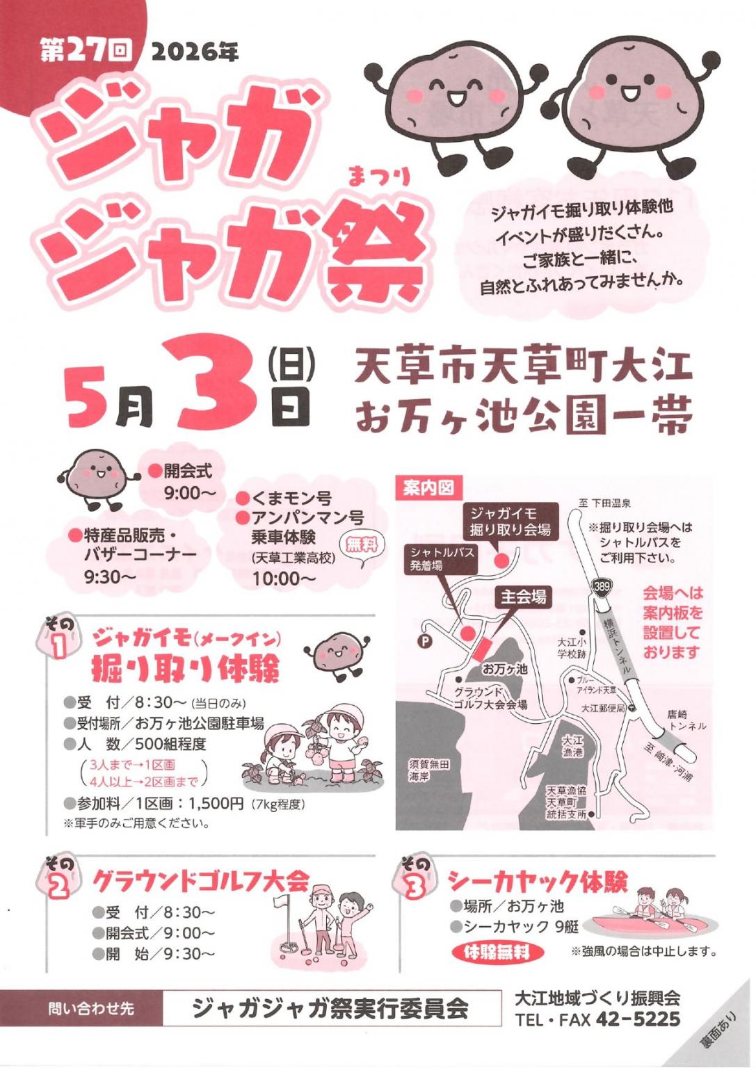 天草・お万ヶ池公園一帯で、今年も「ジャガジャガ祭」が開催されます!ジャガイモ(メークイン)の掘り取り体験をはじめ、シーカヤックやグランドゴルフなど、楽しいアクティビティが盛りだくさん。さらに子どもに大人気のアンパンマン号やくまモン号にも無料で乗ることができます。そのほか、バザーや特売品の販売もあって、一日たっぷり楽しめますよ。ゴールデンウィークのお出かけに、ぜひ足を運んでみてはいかがでしょうか。