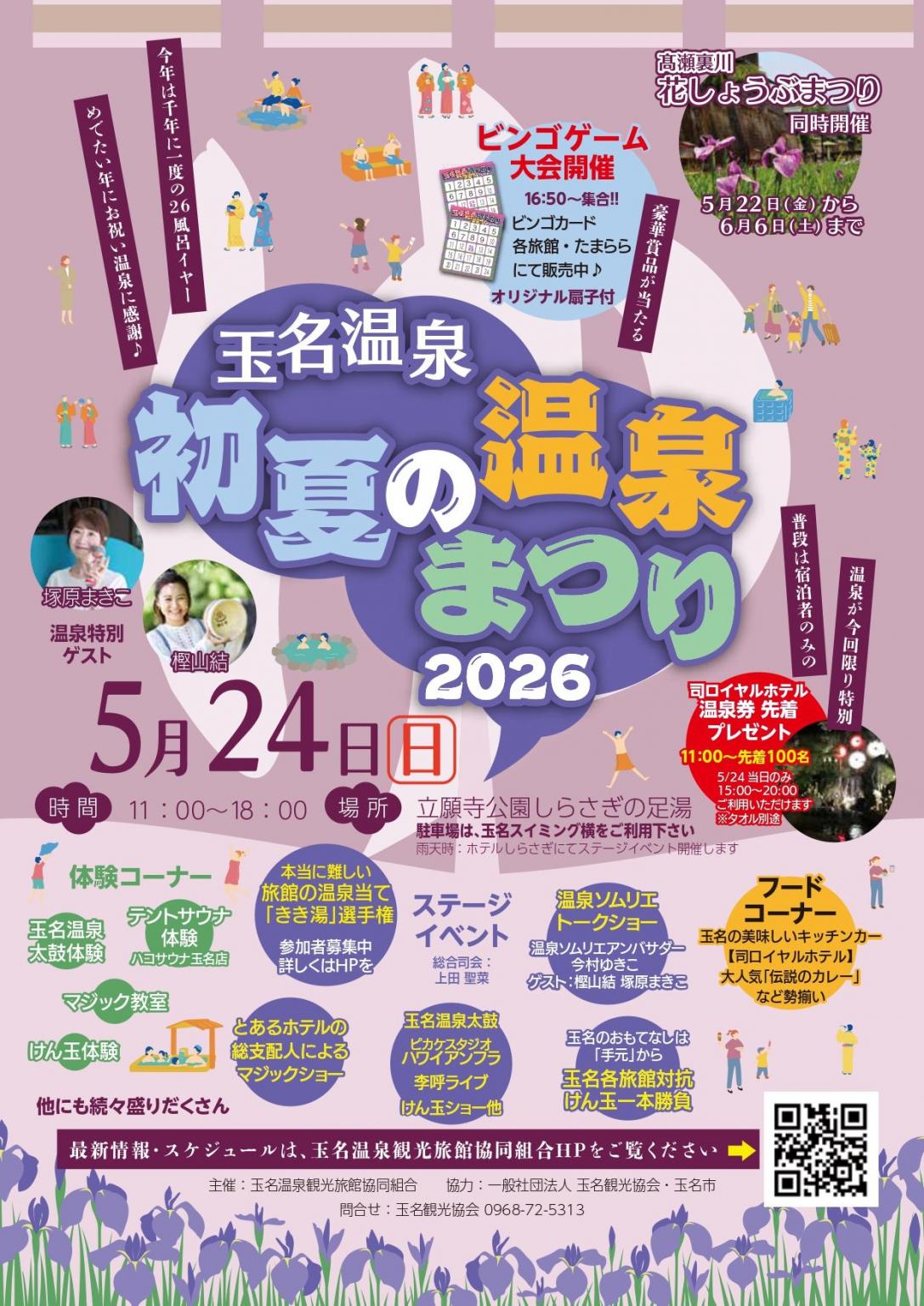 玉名市の立願寺公園内しらさぎの足湯で温泉まつりが開催。当日は11時から普段は宿泊者しか利用できない司ロイヤルホテルの温泉券を先着100名にプレゼント(※当日の15時~20時のみ有効)。けん玉や和太鼓などの各種体験をはじめ、マジックショーやライブ、くまモンも登場予定のステージイベントも楽しめます。そのほかキッチンカーなどのグルメや、豪華賞品が当たるビンゴゲームなども!また、車で約5分の玉名市高瀬裏川水際緑地一帯では"高瀬裏川花しょうぶまつり”も行われているので、あわせて訪れて、初夏の玉名を満喫してみてはいかがでしょうか。