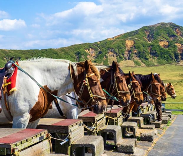 阿蘇山を代表する観光地のひとつ。標高約1,100mの高さにあり、放牧された馬が悠々と歩く姿や、噴煙を上げるダイナミックな阿蘇中岳火口が見渡せる絶好のロケー…