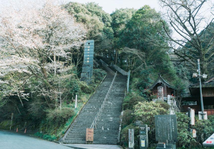 豊かな森林や里山に恵まれた美しい景色が魅力の下益城郡美里町。この大行寺山(標高957メートル)へと向かう道に「日本一の石段」はあります。山の頂上付近にある「金海山 大恩教寺 釈迦院」の表参道の御坂に、約10年の工事を経て1988(昭和63)年3月に完成したというこの石段。体力作りや散策、そして日本一への挑戦をしに多くの人が訪れるスポットです。