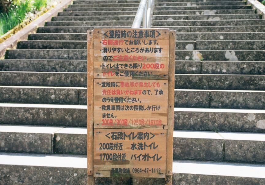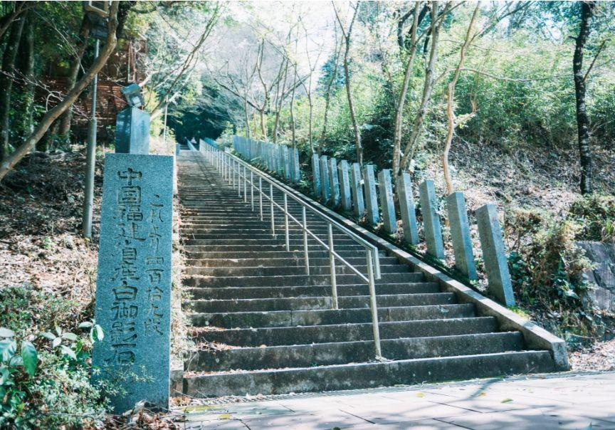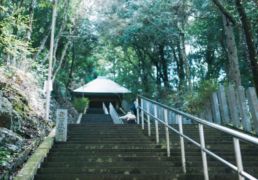 石段の登り口へと到着しました。動きやすい服装で臨みます。途中に自動販売機などはないため、水分は持参するようにしましょう。