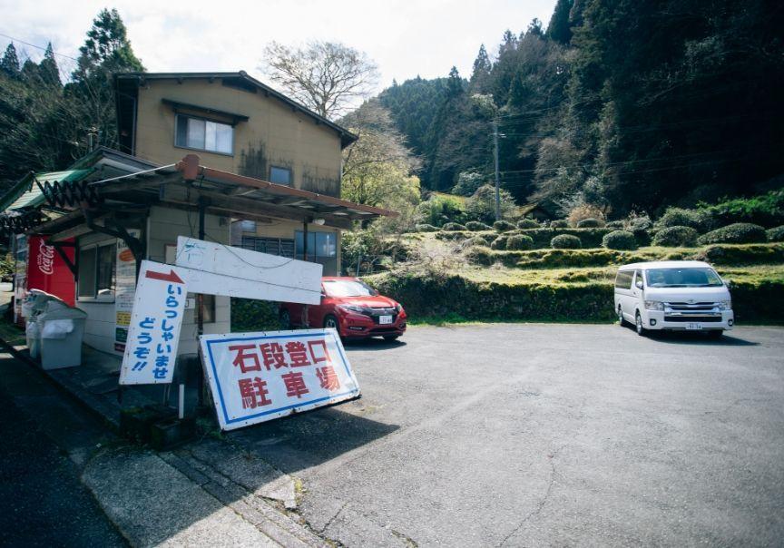 国道から山手への道を上ると「日本一の石段」へと到着します。周辺には有料駐車場が豊富にあるので安心です。