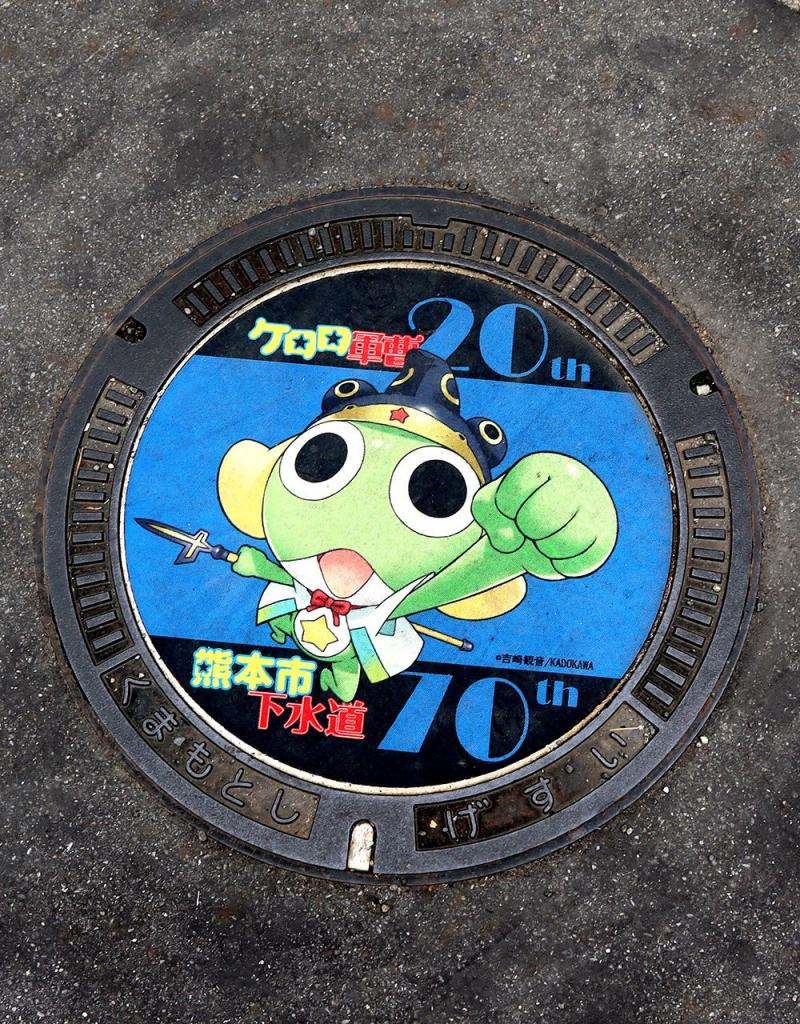 熊本市で探すデザインマンホール、まだまだあります。マストでチェックしたいのが、ケロロ軍曹とコラボした2つのデザインマンホール。どちらも可愛いので、写真に収めるだけでもワクワクすること間違いなしですよ。そのうちの一つはマンホールカードとして配布中なので、こちらも忘れずにゲットしてみて。