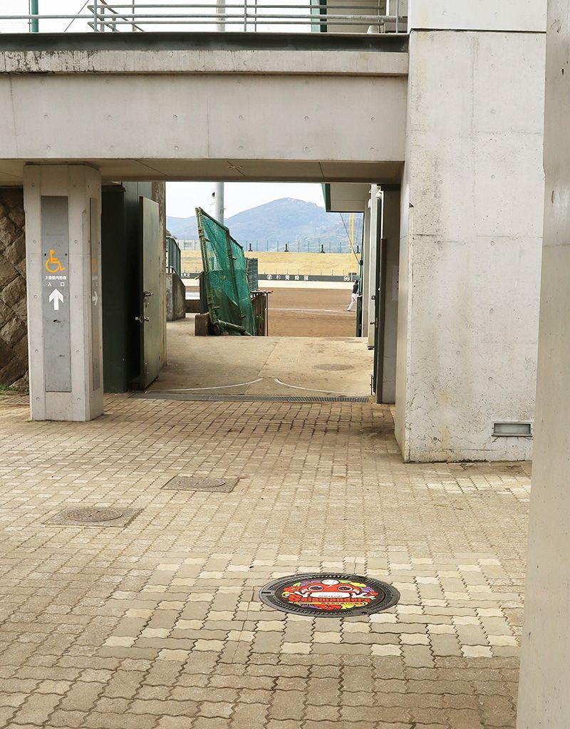 ここで探すのは、もちろん「火の国サラマンダーズ」のデザインマンホール。球場の入口を見ると、何か輝くものが! 一番わかりやすい場所に設置されているようです。