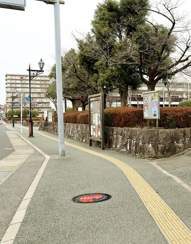 まずは辛島公園前の歩道で、1つめ「ロアッソ熊本」のデザインマンホールを発見。写真の左側が桜町バスターミナルになります。