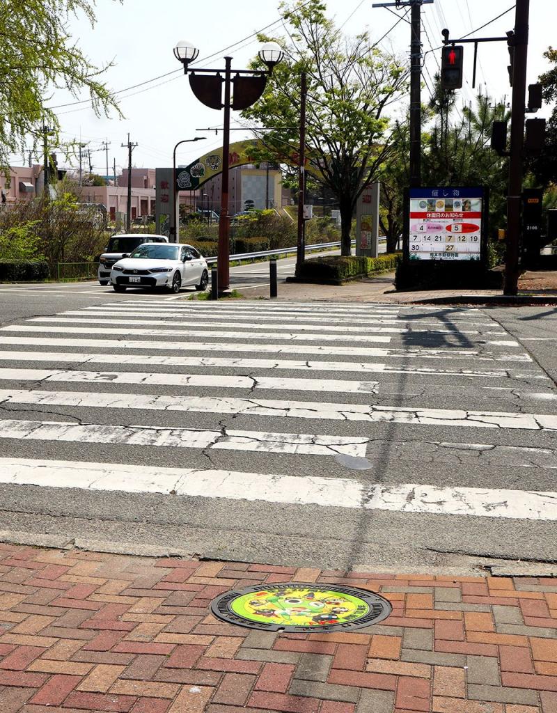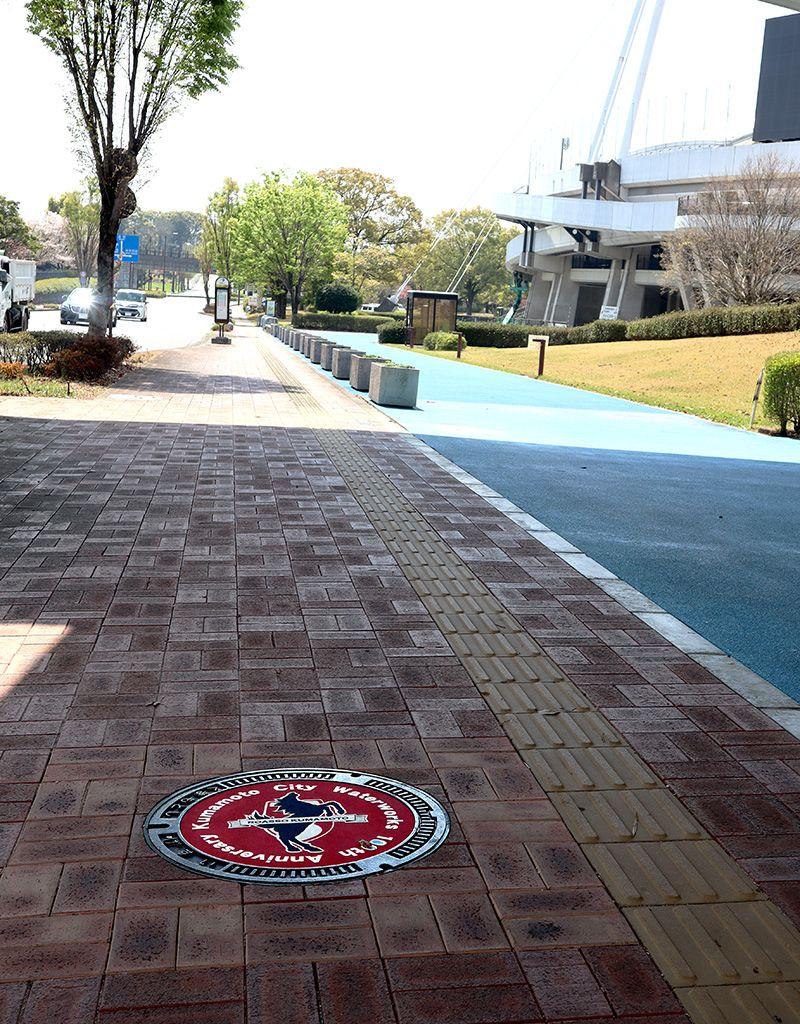 まず向かったのは、阿蘇くまもと空港から車で約15分の熊本県総合運動公園。敷地内にある「えがお健康スタジアム」周辺の歩道に、Jリーグ「ロアッソ熊本」のデザインマンホールが設置されています。