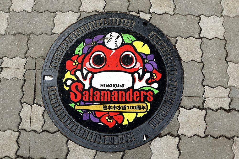 プロスポーツチームとのコラボデザインマンホール。最後にご紹介するのは、熊本の高校野球の聖地となっている「リブワーク藤崎台球場」。熊本城からは徒歩7分の立地で、野球チーム「火の国サラマンダーズ」のホームグラウンドになっています。