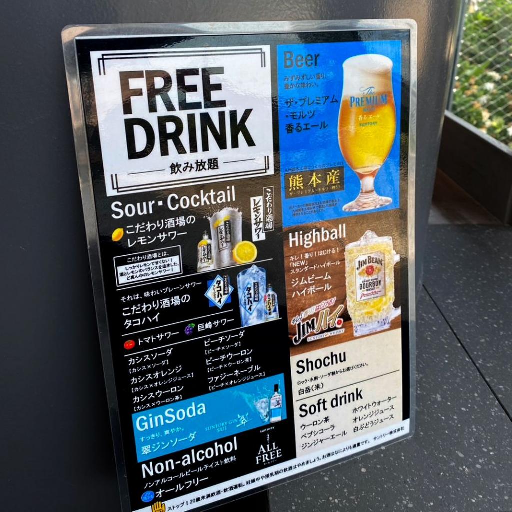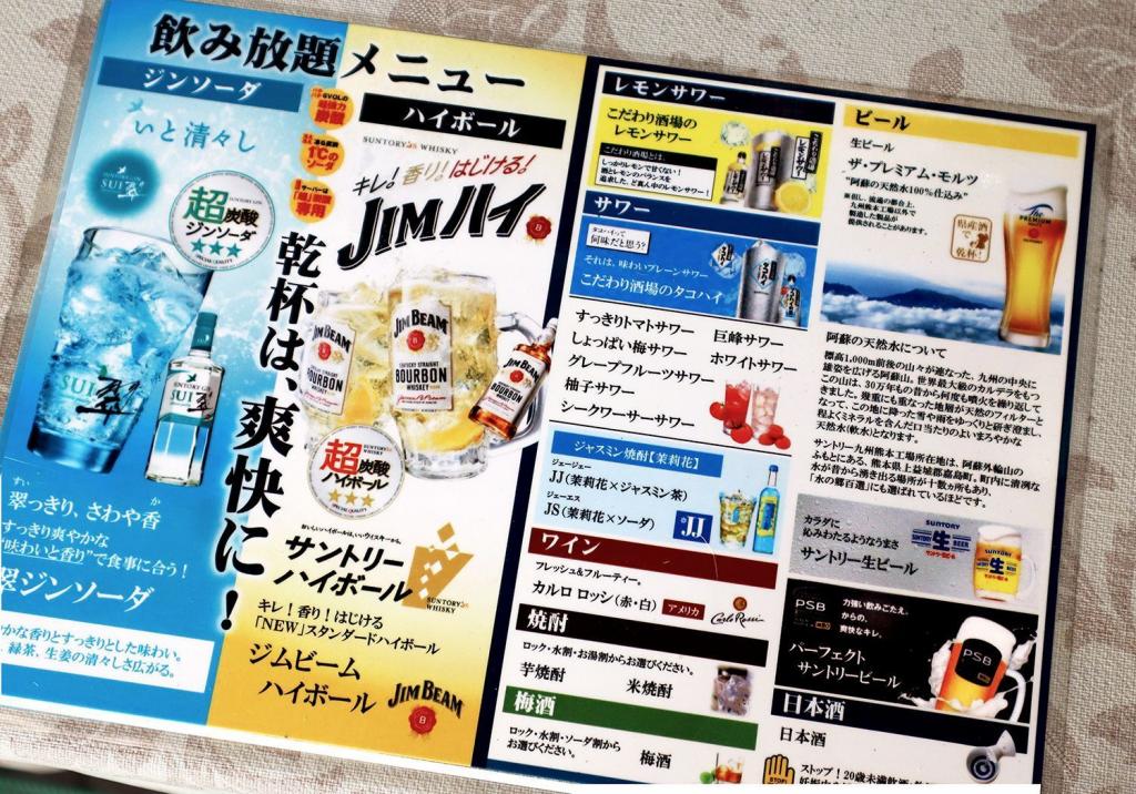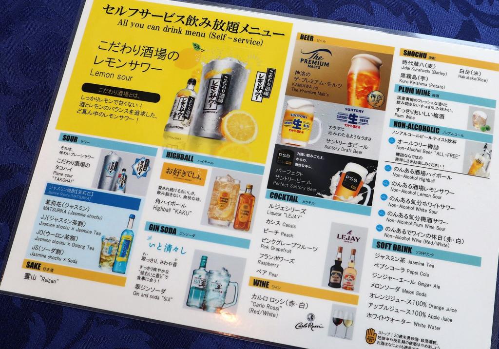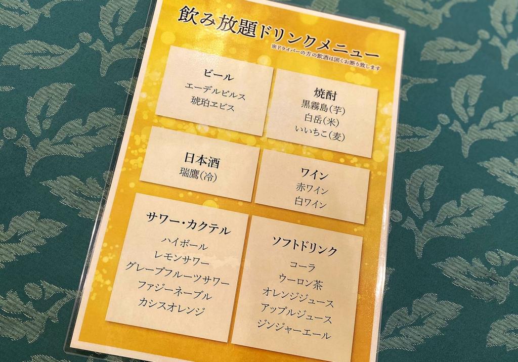 コースはそれぞれ120分制。これに別料金で、アルコールorソフトドリンクの飲み放題が追加できます。