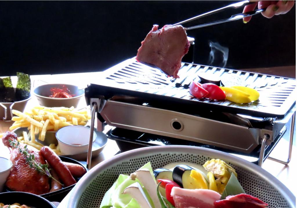 期間中、ディナー会場の「おやねテラス」にはタープが張られ、その中で本格的なBBQができるように。駅チカ&街ナカなので、仕事帰りのサラリーマンの利用も多いそう。コンロで豪快にお肉を焼きながら、冷えたビールと共に味わってみては。