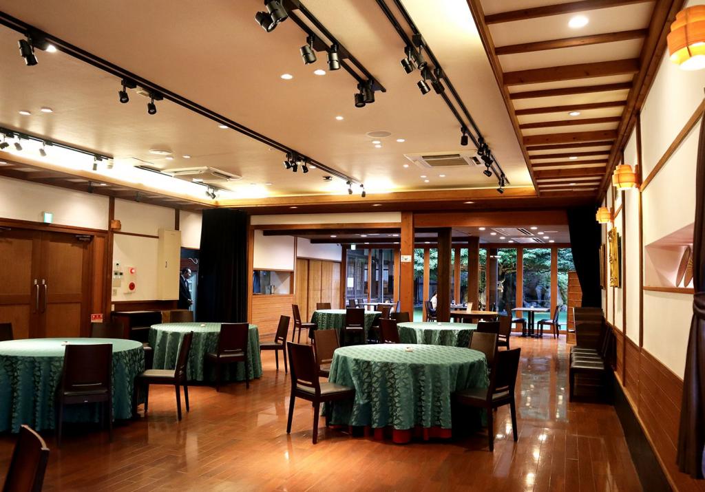 ゆったりと落ち着きのある会場は、最大50名まで収容可能。卓盛り形式で料理が提供されるので、和気あいあいとした集まりにもピッタリです。ライトアップされた庭園を眺めながら、プレミアムなひとときが過ごせますよ。