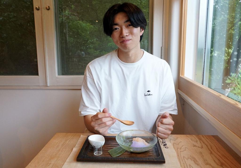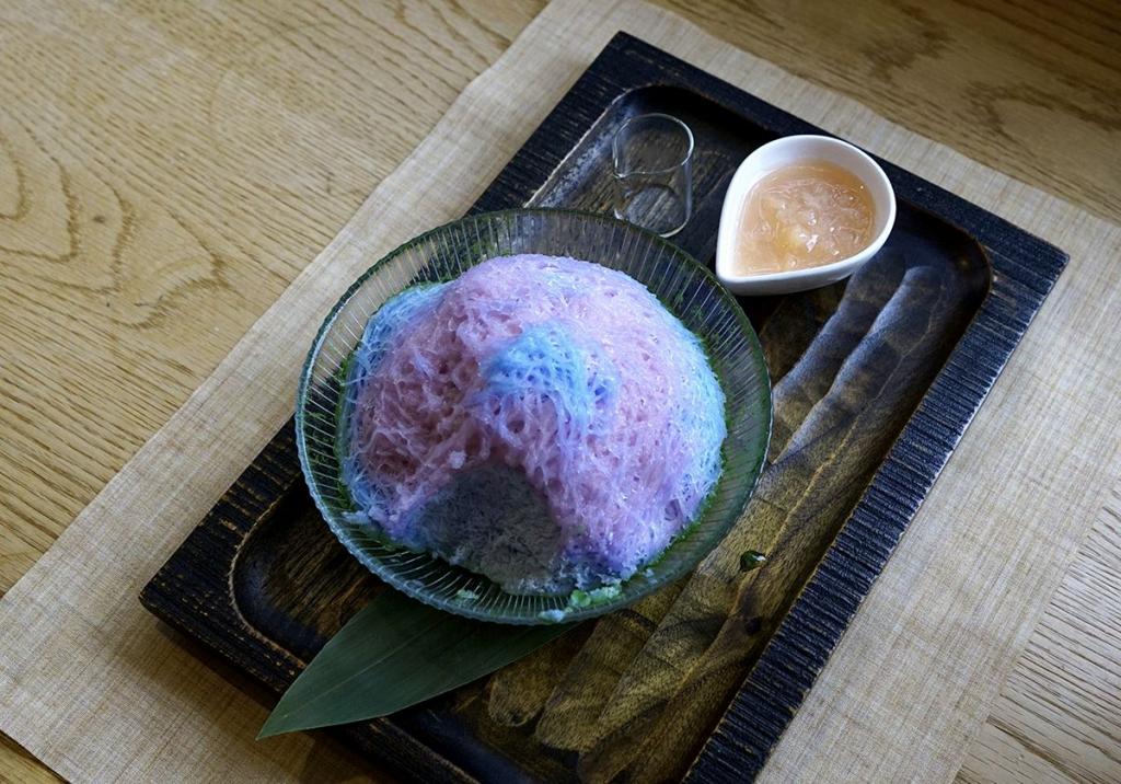 かき氷は、ふわりとした口あたりの中に密度を感じる独特の食感。五木村の柑橘を使用した“くねぶシロップ”をかけると氷が淡い紫色に染まり、まるで紫陽花が咲いたような美しさに。さらに、錦町の桃を使った自家製ソースが重なり、優しい甘さがふんわりと広がっていきます。