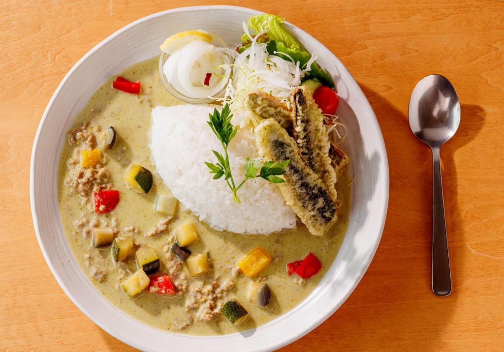 ここで味わえるのは、地元の野菜と豚ひき肉とココナッツミルクを贅沢に使った「グリーンカレー」。具材たっぷりで、+350円でドリンク追加もできます。