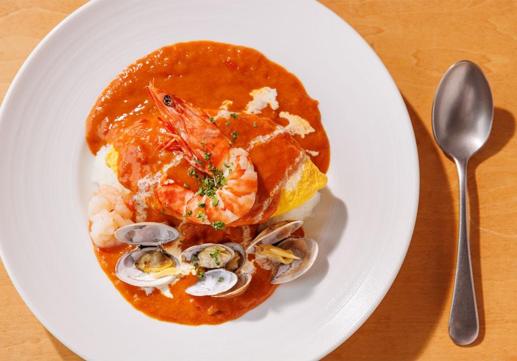ふんわり卵と魚介の旨みたっぷりのカレーは一度食べたらヤミツキに! オリジナルバージョンと食べ比べてみるのもオススメです。