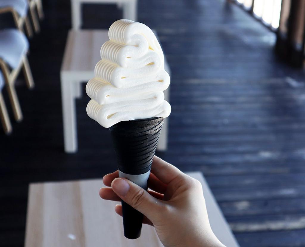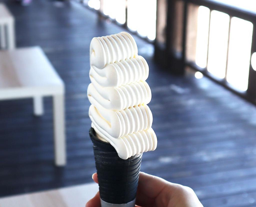白壁が美しい建物の入口にはソフトクリームのオブジェ(看板)が! そう、今回ご紹介するソフトクリームは、こちらのお店の看板メニューのひとつ。他にはない独創的なフォルムで、多くのスイーツ好きを虜にしています。