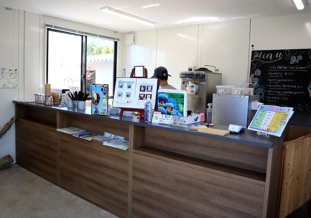 農園の敷地面積は、東京ドーム約1個分。自然に囲まれた中で約30種類、2600本のブルーベリーがポットで栽培されています。カフェで味わえるのは、このブルーベリーを贅沢に使ったソフトクリームとドリンク。高森の風景を五感で感じながら、ここでしか体験できない時間も一緒に楽しめます。