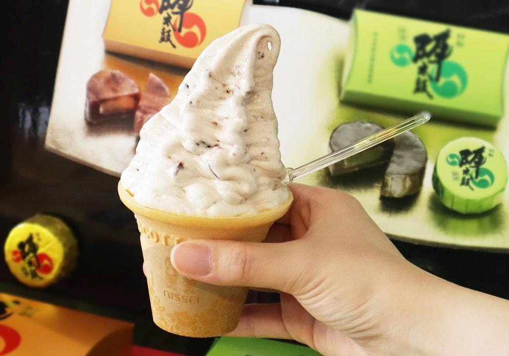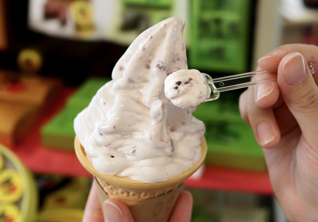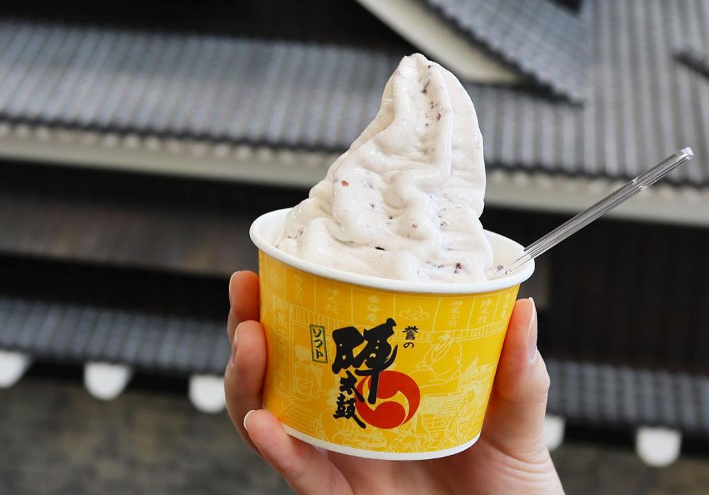 気になる陣太鼓ソフトのお味は…。最高級の小豆で炊き上げた“誉の陣太鼓”の餡と、濃厚なミルクアイスがベストなバランスで混ざり合って、美味しいの一言。甘さが上品で、やわらか~く伸びる求肥の食感もたまりません。まさに、和と洋のいいとこどり。若者だけではなく、年配のファンが多いのも納得です。