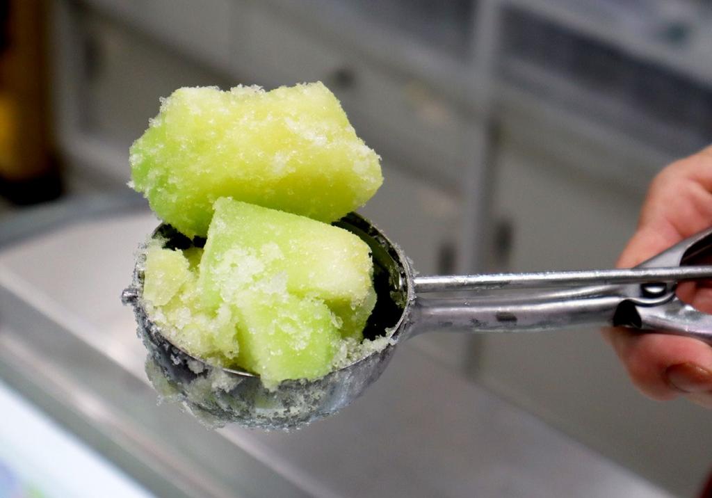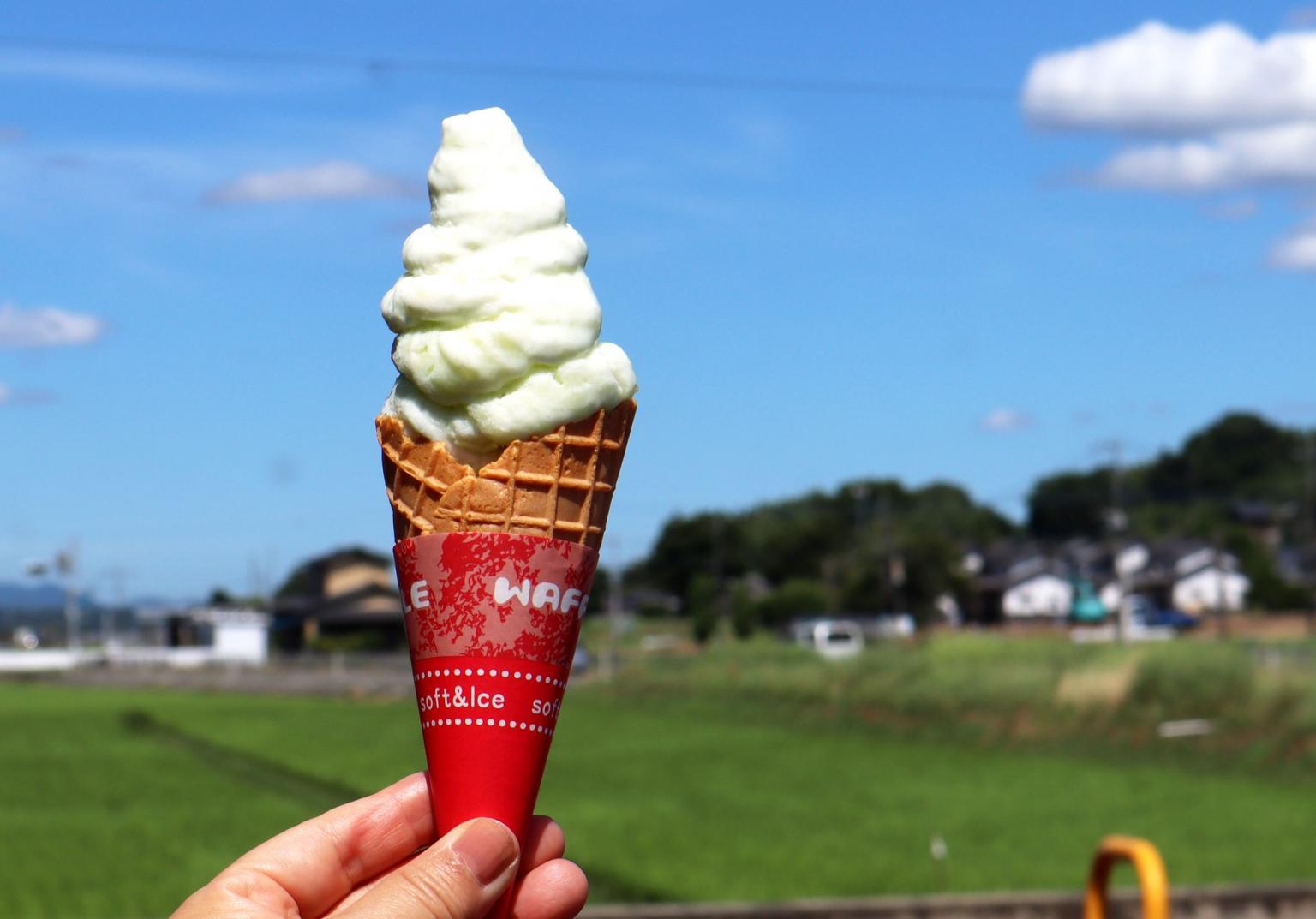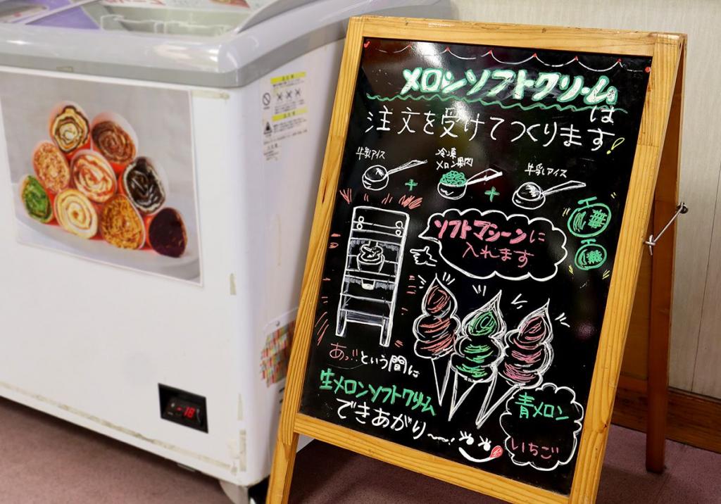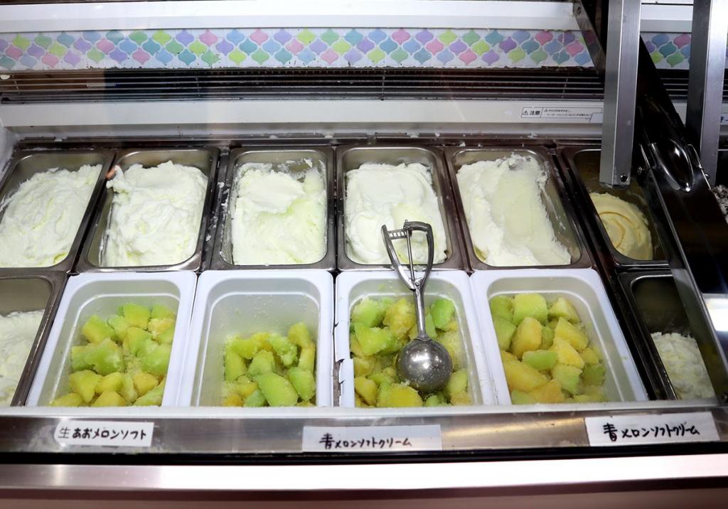 多くの人のお目当ては、地元・菊池産のメロンを贅沢に使った「生メロンソフトクリーム」。果肉たっぷり&程よいシャキシャキ感がたまらないソフトクリームで、使用するメロンは全て、糖度14度以上という高級メロンのみ! シーズンに農家さんからまとめて仕入れて、冷凍したものを使用するので、高クオリティ+低価格が実現できるそうです。