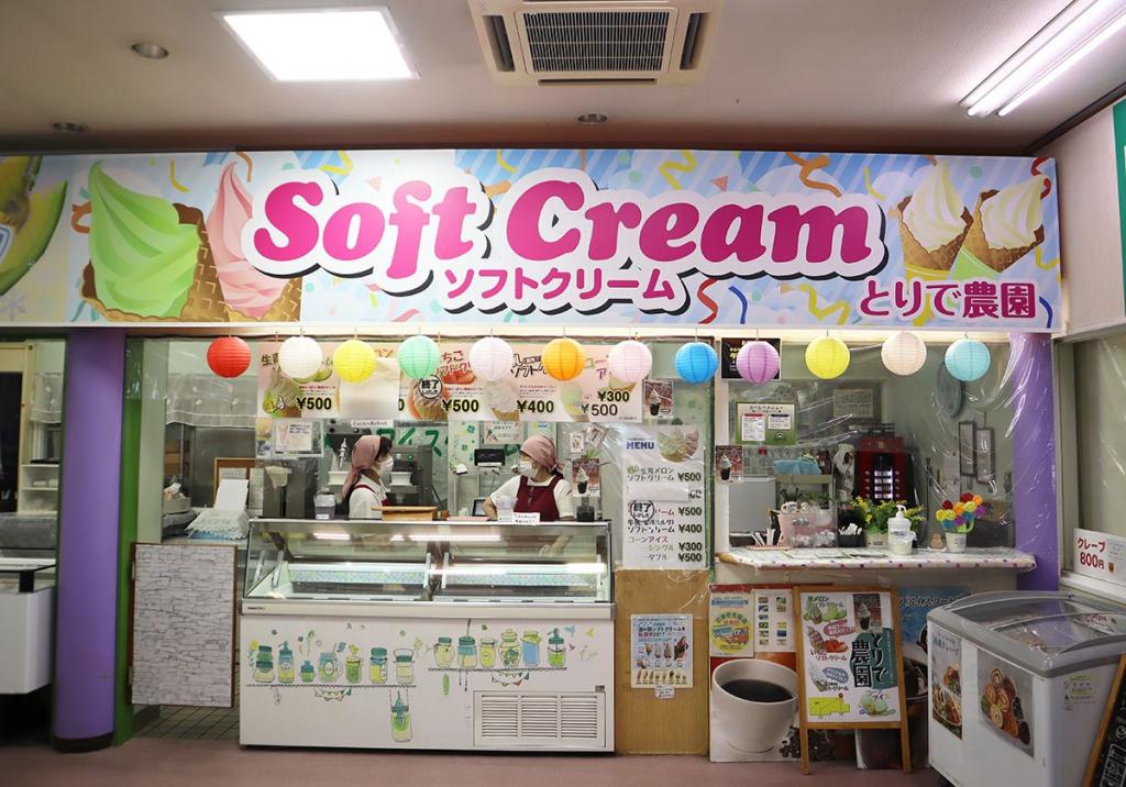 3つのメロンの屋根が目印。年間100万人以上が訪れる道の駅・七城メロンドームの中で、お盆や夏休みになるとオープン前から行列ができるテナントがあります。それが「とりで農園」。地元産のフルーツを使ったジェラートやソフトクリームを提供するお店です。