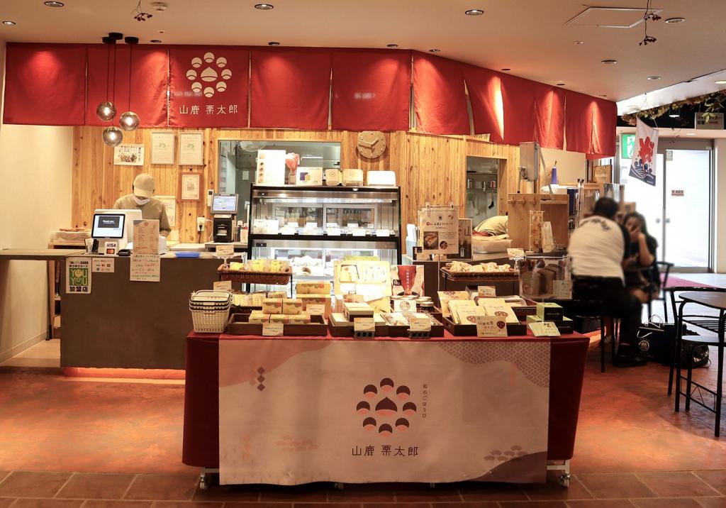 国の重要文化財「八千代座」から徒歩7分の場所にある商業施設・温泉プラザ山鹿。こちらの1階に店を構える「山鹿栗太郎」は、お団子やカステラ、フィナンシェなど、山鹿和栗を使ったオリジナル商品が人気の和洋菓子店です。