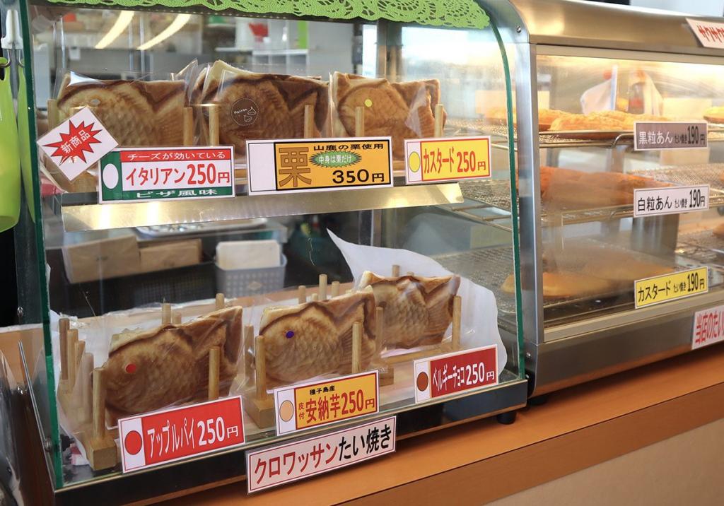 目印は「たい焼き」「たこ焼き」と書かれたのぼり。店内には様々な種類のたい焼きをメインに、たこ焼きやソフトクリーム、栗だんご、山鹿のメロンを使ったメロン100%ジュースなどが販売されています。