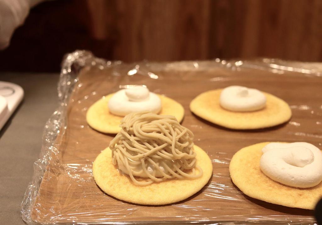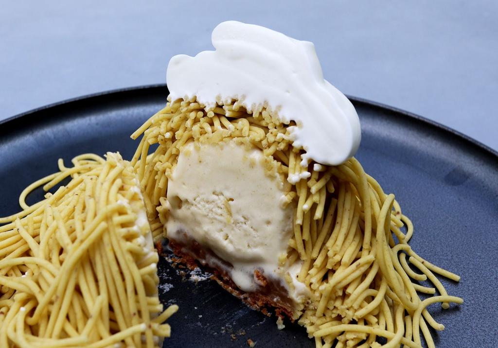 「栗花」は、ヘーゼルナッツのサブレを土台に、白餡と自家製和栗の甘露煮を使ったジェラートを合わせ、濃厚な栗のペーストをたっぷりと絞った究極の一品で、最後に九州産生クリームがトッピングされています。