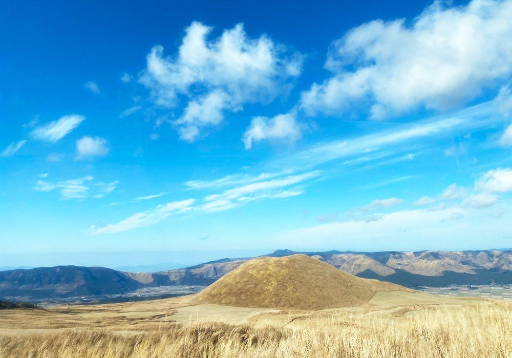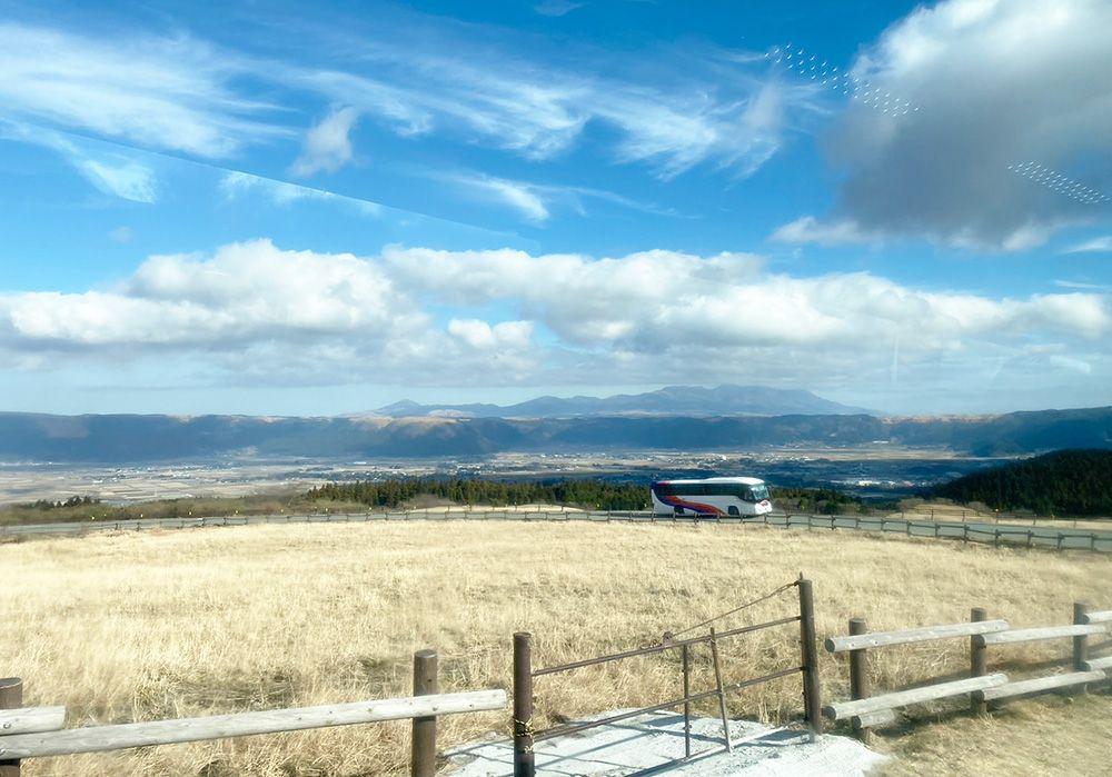 阿蘇駅から山頂ターミナルへ向かうルートはまさに絶景ロード。車窓から見えるのは、大草原の中に放牧された馬や阿蘇外輪山、おわんを逆さにしたような山・米塚など、思わず写真を撮りたくなるような美しい世界。この絶景をゆっくり眺められるのも、ロバの旅の醍醐味。