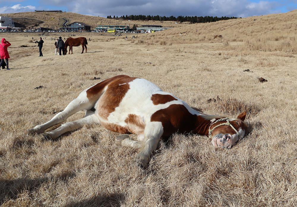 放牧された馬が悠々と歩く姿や、噴煙を上げるダイナミックな阿蘇中岳火口が見渡せるロケーションで、阿蘇観光のド定番スポット。この日はお天気が良く、放牧された牛たちも気持ちよさそうにお昼寝していました。