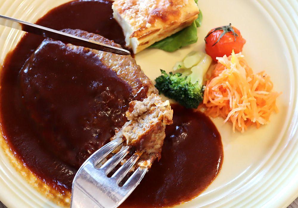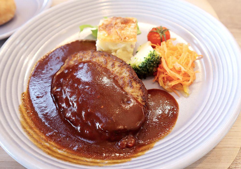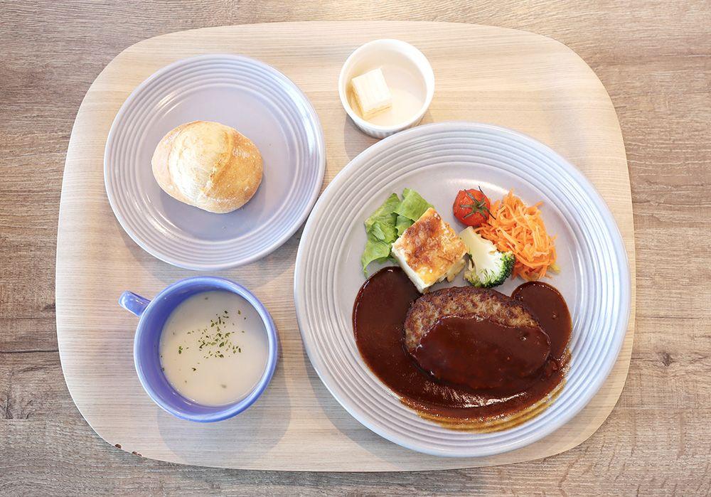 霜降りと赤身のバランスが絶妙で、旨味たっぷりのブランド牛「あか牛」を使ったハンバーグです。パン、スープ、スイーツ、そしてコーヒーまで付いた豪華版。ちょうどいいボリューム感で、ペロリと完食してしまいました。