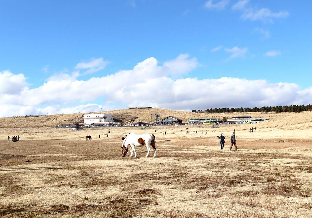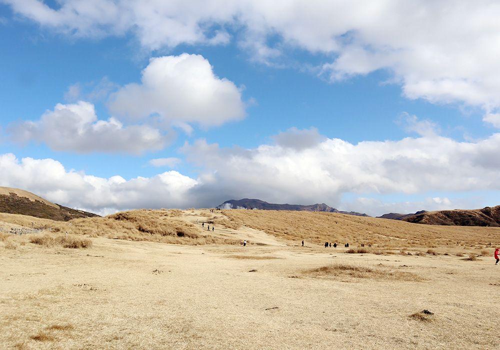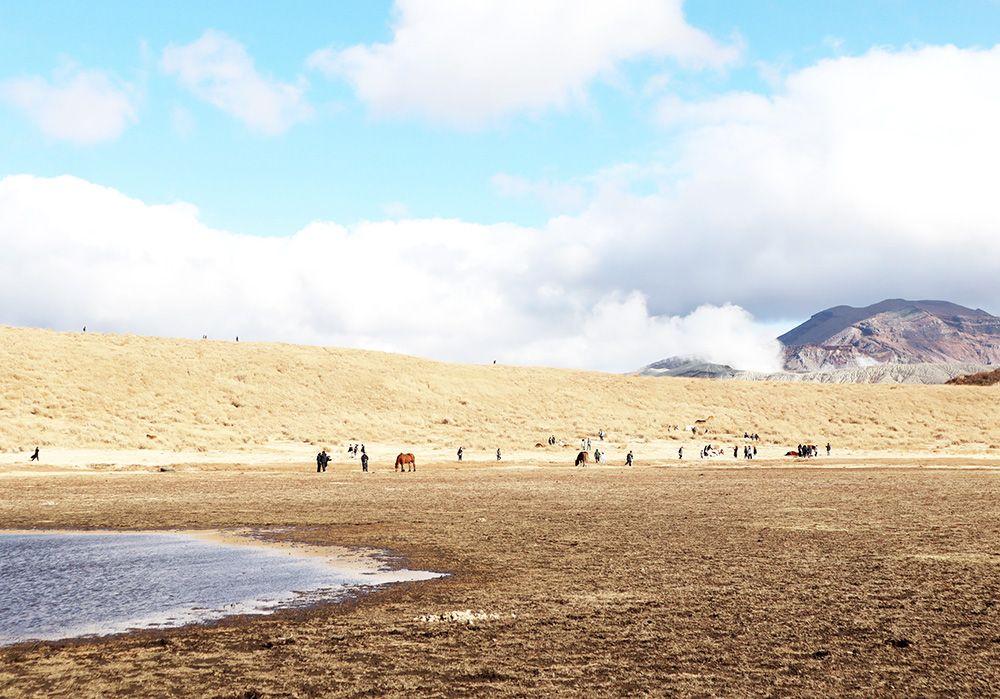 次は、烏帽子岳の北麓に広がる直径約1kmの草原・草千里ヶ浜を散策します。