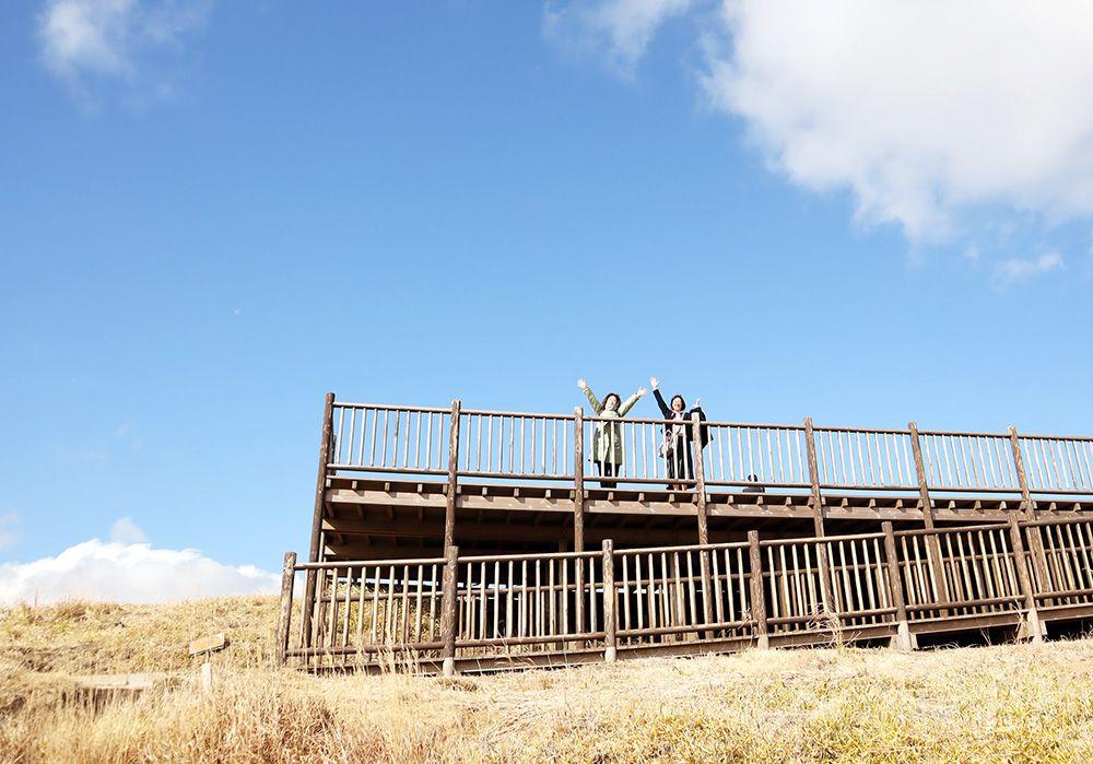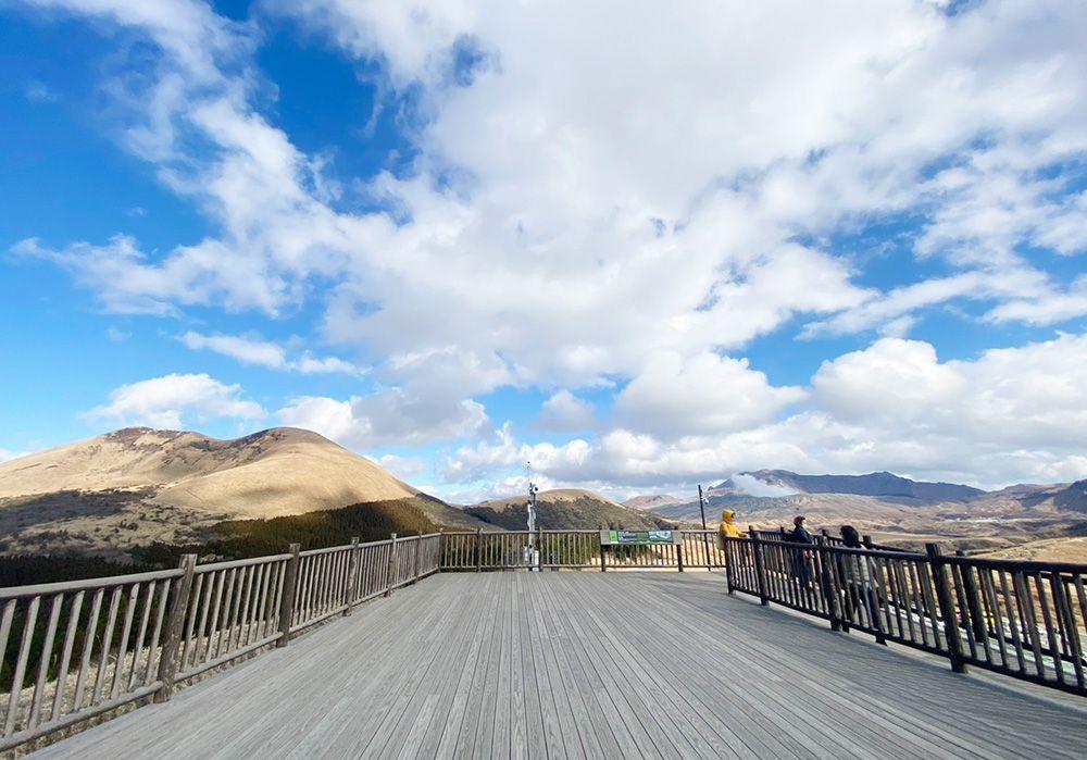 まずは、レストランの裏手あたりにある“草千里展望所”へ。階段を上ったその先に広がっているのは、東側には阿蘇中岳の噴煙、北側には米塚や阿蘇谷の広大な田園風景! 写真映え間違いなしのスポットです。
