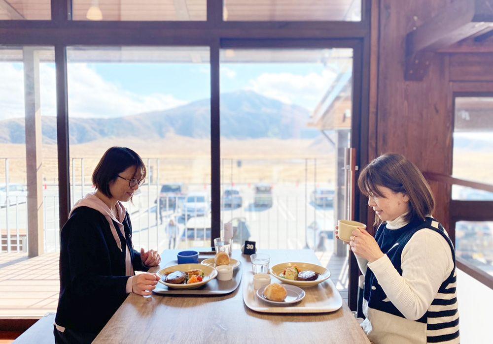 窓の外に広がる草千里ヶ浜の景色を見ながら、時間をかけながらゆっくりとランチタイム。おしゃべりも弾みます。