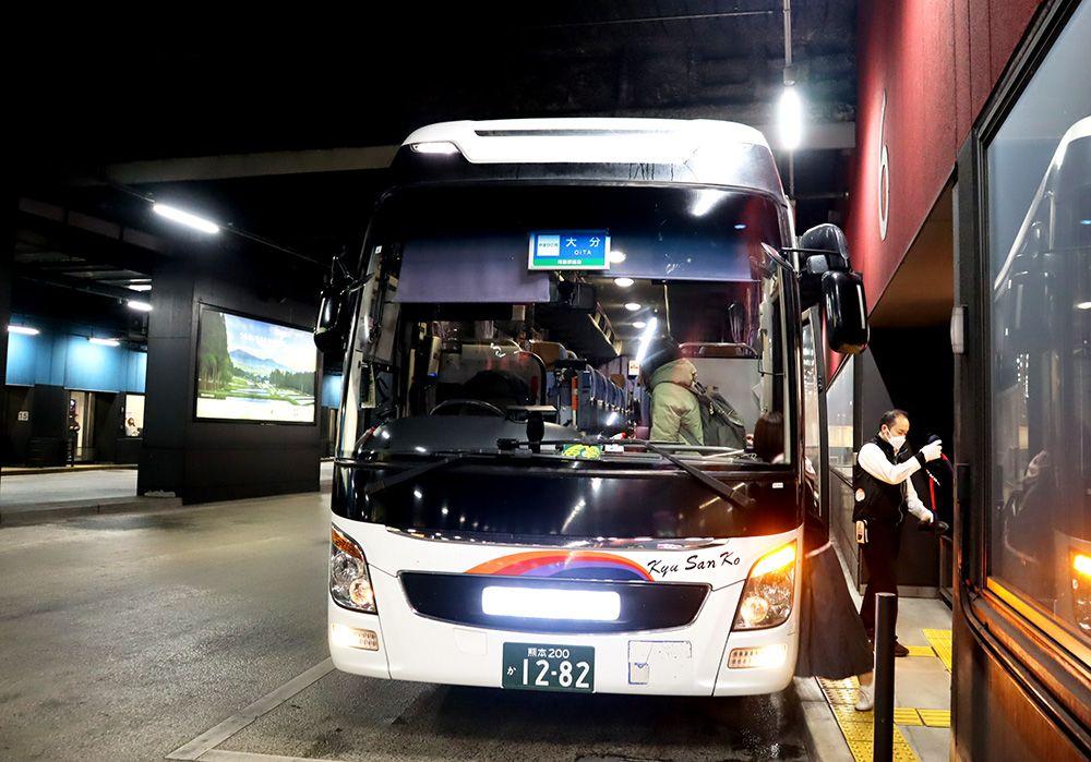 乗車場所は熊本市の中心市街地にある「熊本桜町バスターミナル」。6番(空港行きリムジンバス、特急バス、夜行バス)乗り場で待っていると、「やまびこ号 大分行」が到着。このバスに乗車します。